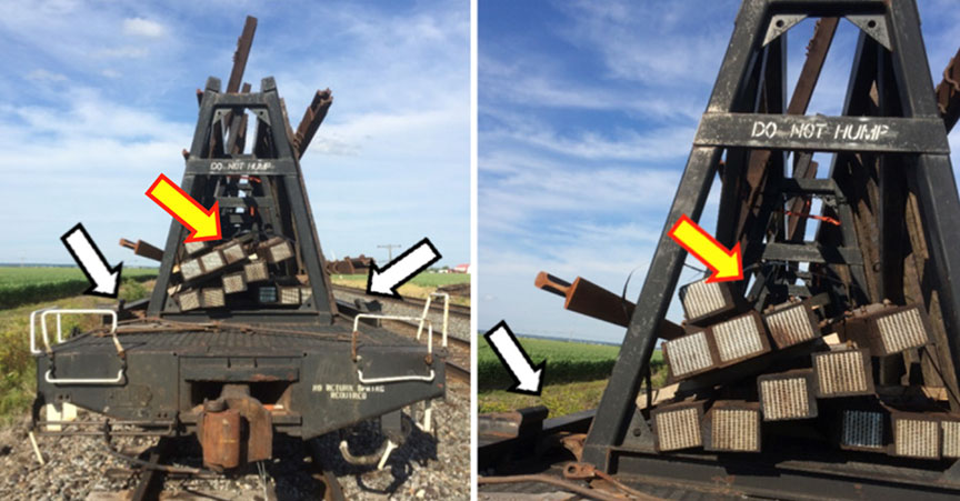 Figure 1. Car CP 421885 (view of trailing end). Note: The yellow arrow indicates the location where the ties and stock rail had been strapped with steel banding to the deck. The white arrows indicate the mount locations where stock rails should be secured using elastic fasteners.