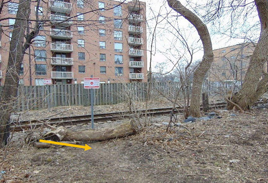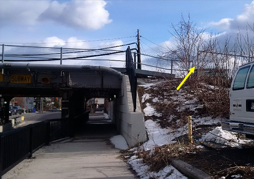 Pathway up the embankment at Howland Avenue (arrow pointing to gap)