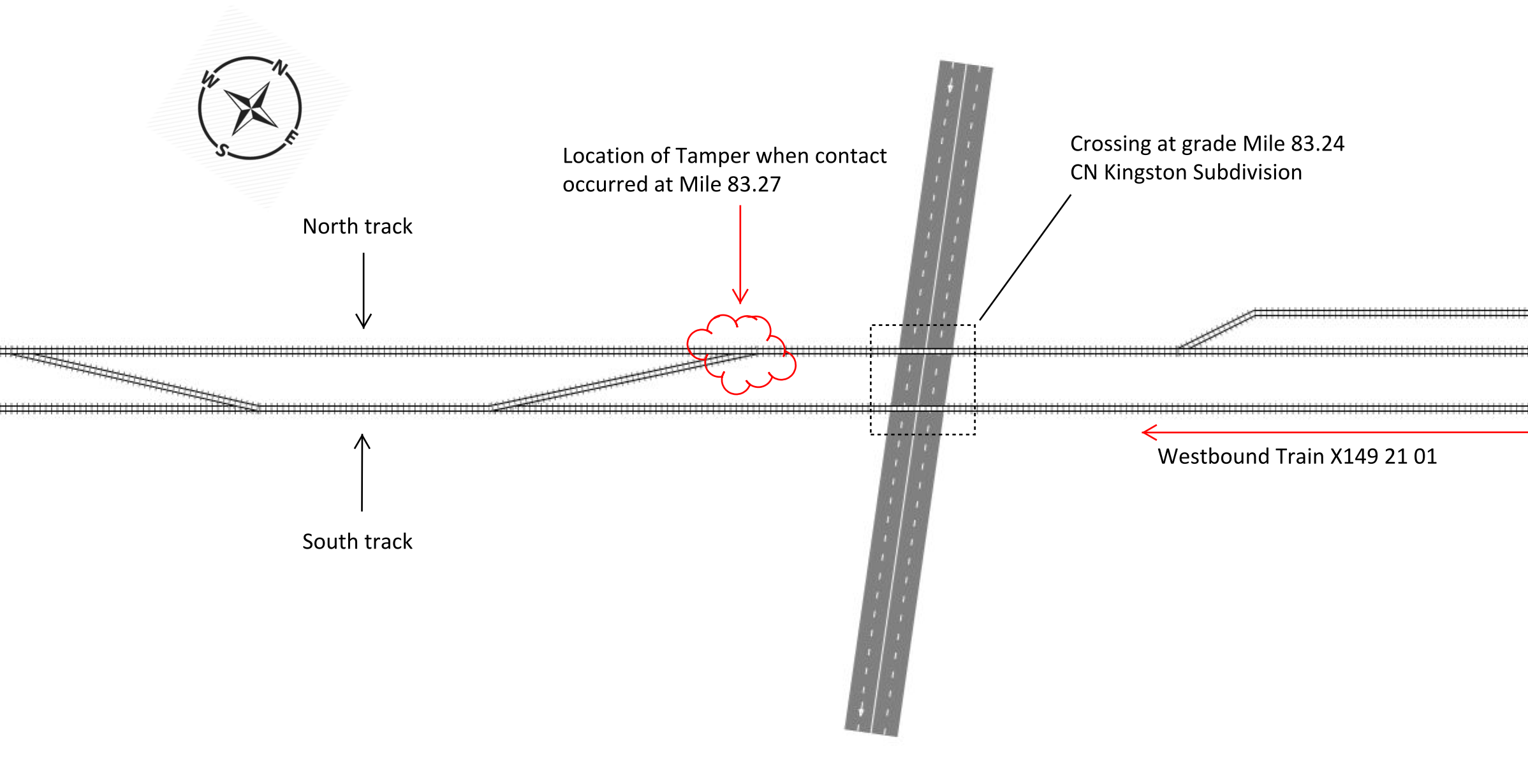 Neither the Rule 42 foreman nor the sub-foreman had been in a position to notice that the tamper’s appurtenances were foul of the south track. The tamper operator had been continuing his work, unaware of the passing train. As per CN’s Eastern Region Engineering Notice 2017-E-012, work equipment operators can continue to work when a train is passing on an adjacent track in some circumstances