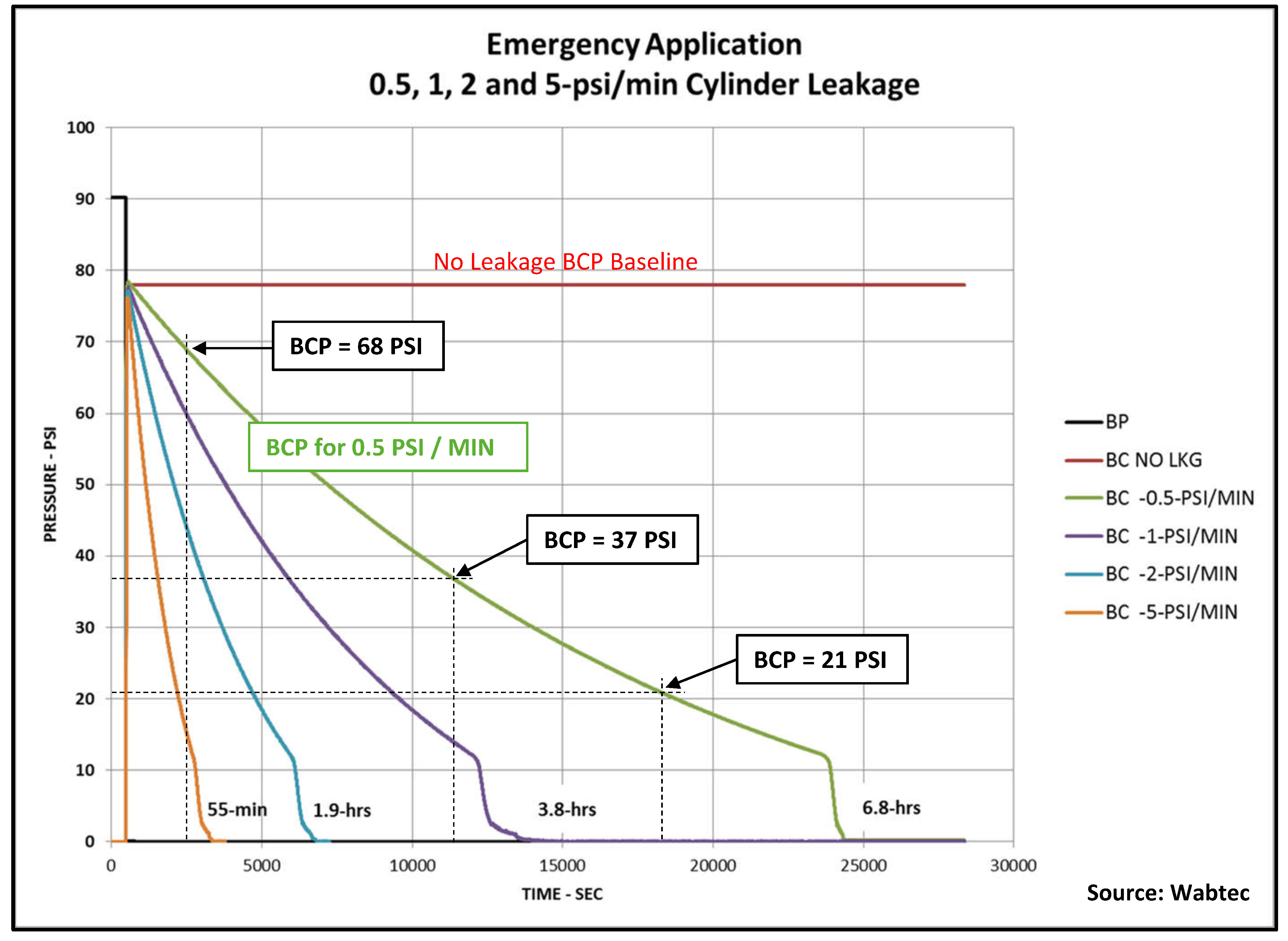 As an example, the BCP trace shown in green corresponds to a leakage rate of 0.5 psi/minute. Starting from a BCP of about 78 psi, brake cylinder pressure reduces by 10 psi, and down to 68 psi in about 2000 seconds (33 minutes) after the application of the emergency brakes.