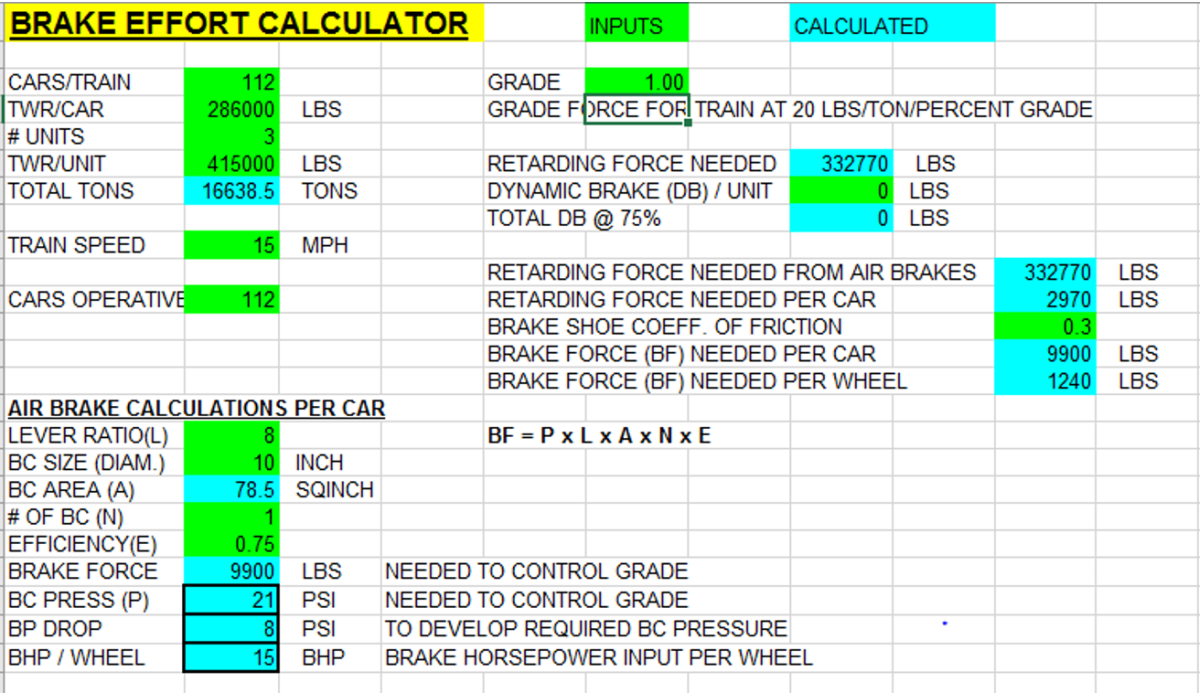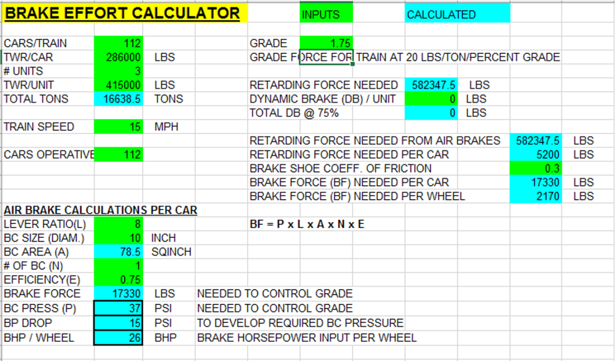 Note: The speed of the train was included to calculate the Brake Horsepower (BHP). However, the speed value does not influence the stationary braking effort calculation. BHP is an important braking parameter for managing maximum allowable wheel tread temperature on rolling stock in motion. BHP is not relevant to a stationary train.