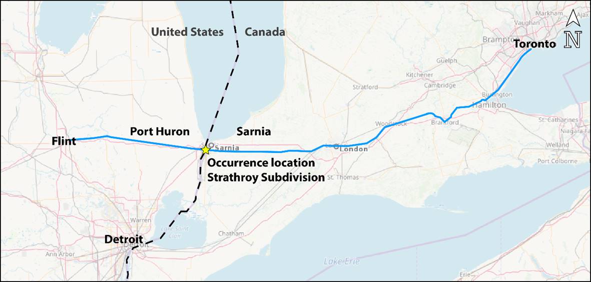 At about 0402 Eastern Daylight Time,Footnote 1 the train, operated by a 3-person crew (i.e., locomotive engineer, conductor and brakeman) departed from Sarnia, Ontario, en route to Port Huron. The train proceeded though CN’s Paul M. Tellier Tunnel (the tunnel) under the St. Clair River, which connects Sarnia to Port Huron and traverses the international border between Canada and the United States (Figure 1).