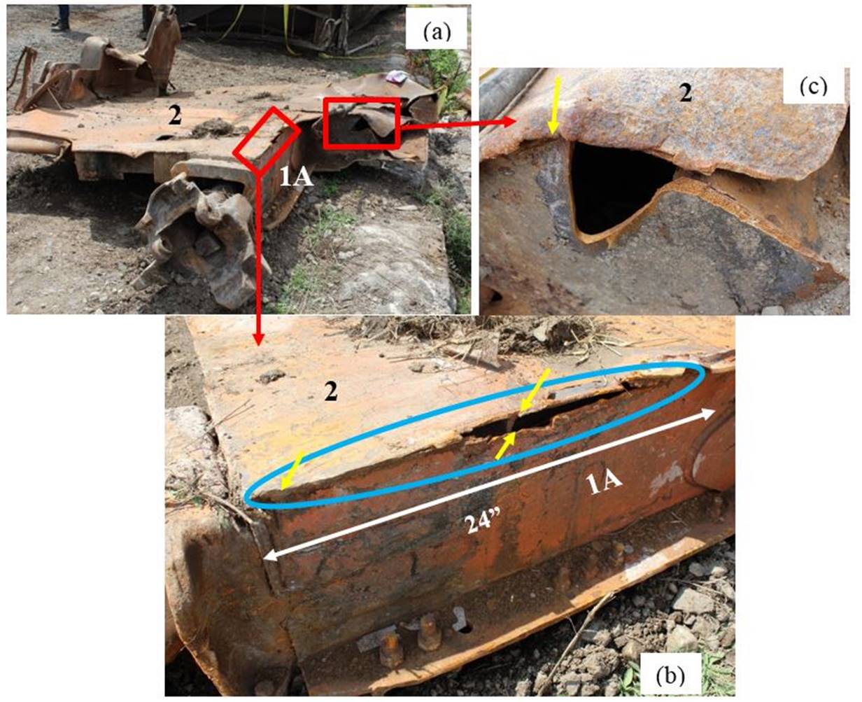 The examination of DJJX 30478 identified that the A-end of the car likely sustained a structural failure when subjected to elevated in-train buff (compressive) forces while travelling within the tunnel. The car had a number of pre-existing defects, such as corrosion and cracks up to 24 inches long in the welds that secured the A-end shear plate to the stub sill, car body bolster and side sills (Figure 3).