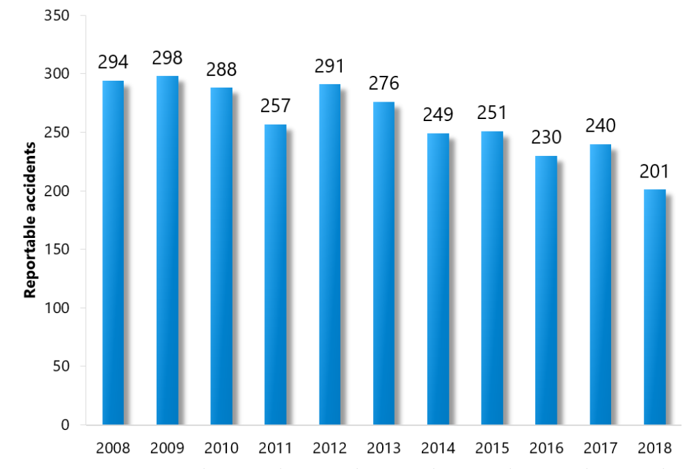 Air transportation safety occurrences are reportable to the TSB if they occur in Canada or if they involve Canadian-registered aircraft and meet the criteria laid out in the Transportation Safety Board of Canada Regulations.Footnote 1 In 2018, a total of 201 air transportation accidents were reported to the TSB (Table 1 and Figure 1). This number is lower than the previous year's total of 240 accidents, and 25% less than the average of 267 reported in the 10 years from 2008 to 2017. Most (180) of the accidents in 2018 took place in Canada and involved Canadian-registered aircraft. Eleven accidents in Canada involved foreign-registered aircraft, and 11 more accidents involving Canadian-registered aircraft took place outside Canada.