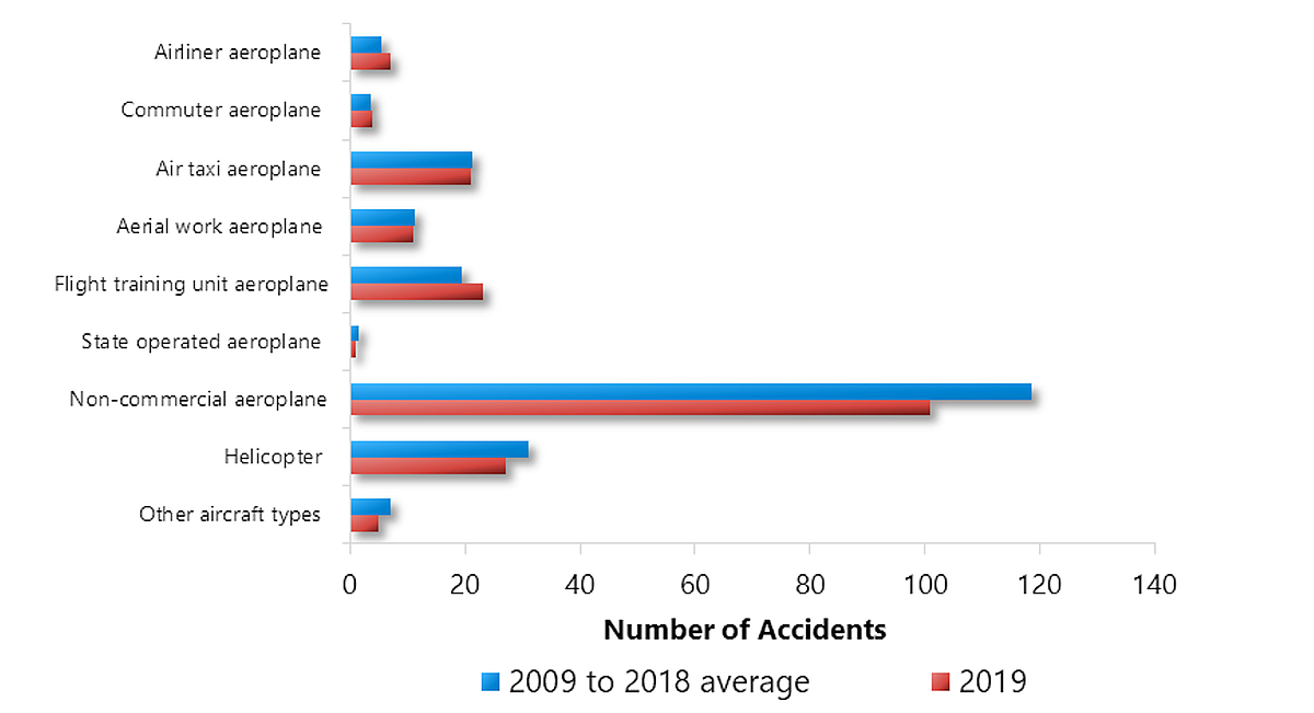 There were 83 accidents that involved commercially-operated aircraft in 2019 (Table 1). This is more than the 66 such accidents recorded in 2018, but still 6% below the average of 88 accidents recorded in the 10 years 2009–2018.