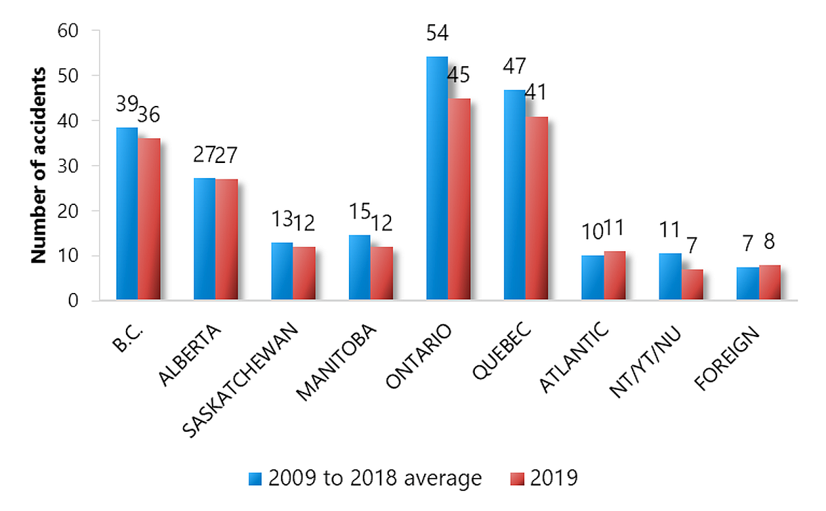 Ontario, with 52 reported accidents (all aircraft types, including ultralights), was the province with the largest number of reported accidents in 2019, as it was in the previous 2 years (Table 7). Ontario also averaged more accidents per year (65) in the 2009–2018 period than any other province or territory, with Quebec having the second-largest average accident count (56) for the same period. British Columbia and Alberta also have high average accident counts compared with the remaining provinces and territories.