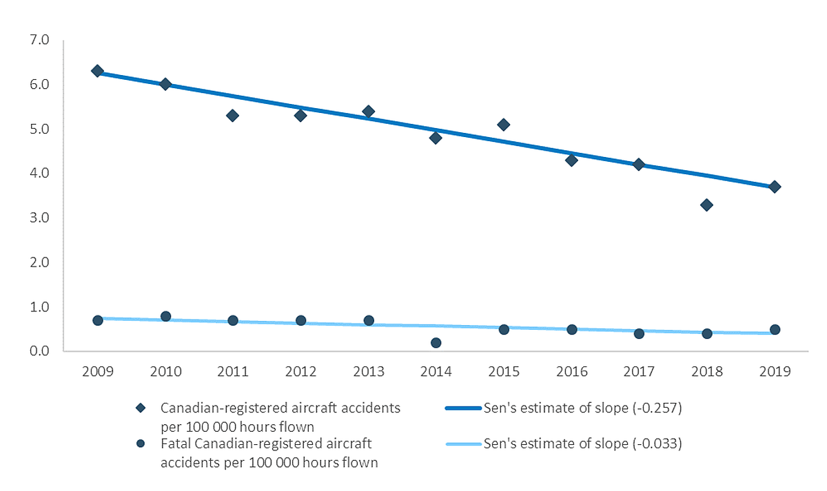 A key indicator of aviation safety is the aircraft accident rate, which is calculated as the number of accidents per hours flown or per number of movements (a movement can be a takeoff or a landing). Performing a trend analysis of accident rates for different types of operators can detect emerging safety issues associated with specific operator types and activities.