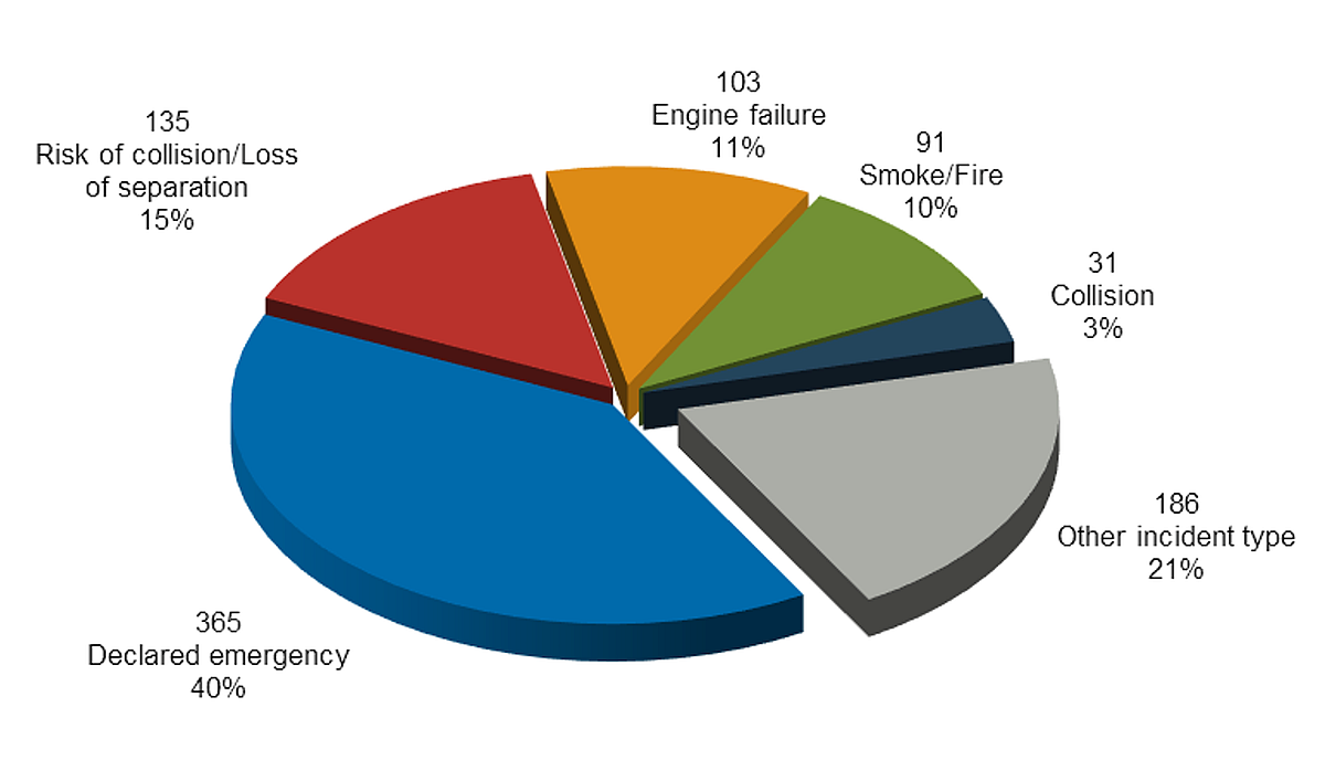 Throughout this document, there are instances where categories of occurrences sum to more than the total number of occurrences. For example, if a single occurrence involves an aeroplane and a glider, the occurrence count will increase by one in each aircraft category but the occurrence itself will be counted only once in the total of occurrences.