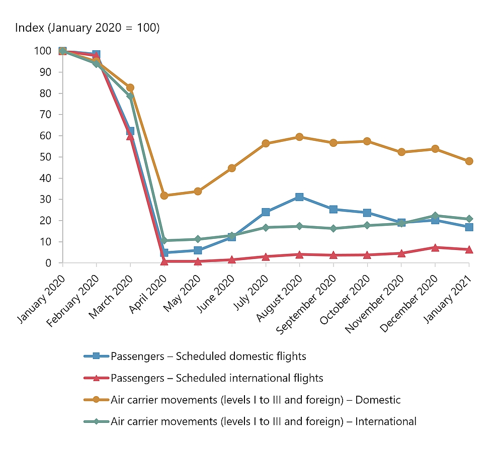 In early 2020, a new coronavirus began to affect air passenger travel in China and Hong Kong. By mid-March, broad travel restrictions were in place in Canada and around the world in an effort to contain the virus. The impact on commercial aviation was immediate, widespread, and lasting, with air transportation activity in Canada being greatly reduced during most of 2020. In April of 2020, total aircraft movements at major airportsFootnote 1 in Canada were roughly 75% fewer than in 2019. While domestic itinerant movements slowly resumed over the remainder of the year, total traffic continued to be greatly reduced. In January of 2021, total aircraft movements at major Canadian airports remained 30% fewer than in January of 2020.Footnote 2 Major Canadian airlines carried 797 000 passengers in January of 2021, which is 89% fewer than a year before.Footnote 3 Notably, Statistics Canada data for major airports indicate that itinerant (point-to-point) movements were down 41% in calendar year 2020 compared to 2019, but local movements (returning to where they took off) were down by only 20% for the same periods.Footnote 4 Unfortunately, data for small airports (without NAV CANADA towers or flight service stations) are no longer available from Statistics Canada.