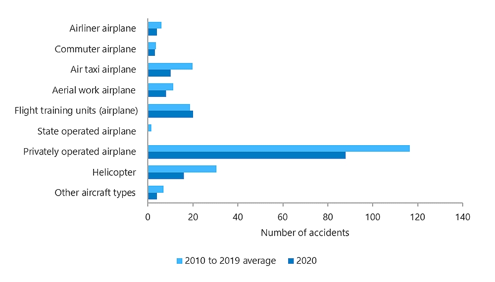 Overall in 2020, 114 air transportation accidents involved non-commercial (i.e., private aircraft) operations (Table 1), compared to 143 in the preceding year. This is 28% below the annual average of 159 accidents from 2010 to 2019. Of the 114 total accidents in the non-commercial (private aircraft) operations category, 88 involved Canadian-registered airplanes (Table 2), and 2 of these 88 were operating under CARs Subpart 604 with a Private Operator Registration Document (PORD).