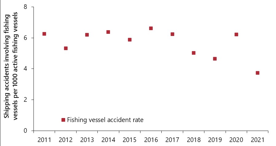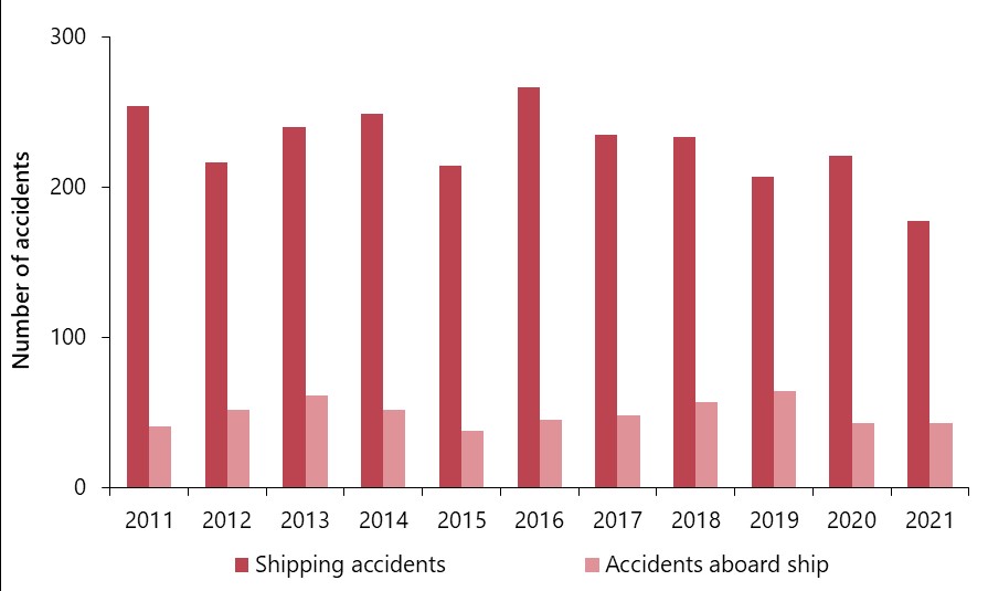 In 2021, there were 43 accidents aboard ship, unchanged from 43 in 2020 and down from the 2011–2020 average of 50. The majority of accidents aboard ship occurred on fishing vessels (53%) and cargo/tanker vessels (30%) (data not shown).