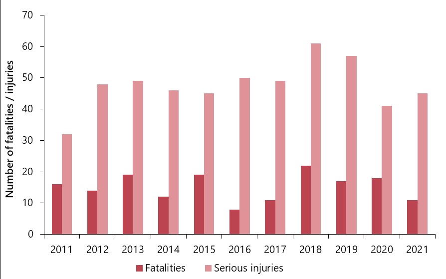Serious injuries in 2021 totalled 45, up from 41 in 2020 but down from the annual average of 47 from 2011 to 2020. Forty of the 45 serious injuries (89%) resulted from accidents aboard ship, and 5 resulted from shipping accidents.