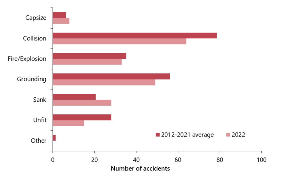 As illustrated in Figure 3, the most frequent types of shipping accidents in 2022 were collision (32% of all accident types reported), grounding (25%) and fire/explosion (17%). The total number of collisions (64) was 18% less than the 10-year (2012 to 2021) average of 79, the number of groundings (49) was 13% below the 10-year average of 56 and the number of fire/explosion accidents (33) was 6% below the 10-year average of 35.
