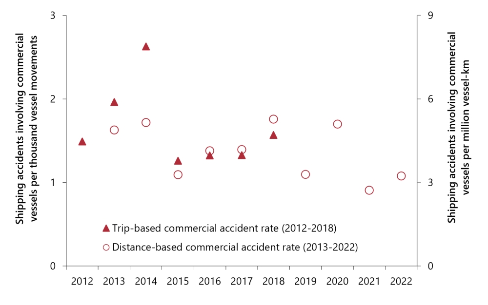 According to information provided by Transport CanadaFootnote 3, marine activity for Canadian commercial non-fishing vessels over 15 gross tons (GT) (excluding passenger vessels and cruise ships) was 147.303 million commercial vessel-km in 2022, which is 10% above the 2013 to 2021 average.Footnote 4 This yields a rate of 3.0 shipping accidents per million commercial vessel-km in 2022, lower than the prior 9-year average of 4.0.