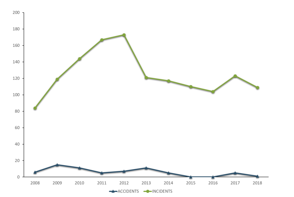 In 2018, 44 incidents (40% of 110 total incidents) involved “geotechnical, hydrotechnical or other environmental activity”, for example, slope movements or river erosion that exposed a length of pipe. This is a significant increase from 16 reports of this type in 2017 and well above the average of 3 such events per year over the previous 10 years. These may be related to increased company enforcement, combined with increased company inspections and reporting, as well as changes to weather patterns. Thirteen of the 110 incidents involved “operation of the pipeline beyond specified limits”, which is on par with the average of 14 incidents of this type over the previous 10 years. There were 9 reports of pipelines being “contacted by other objects” in 2018, an increase over 4 such reports in 2017 and above the average of 5 reports per year during the previous 10 years. “Fire” was an event in 5 occurrences (4 incidents and 1 accident) during 2018, compared to 8 occurrences in 2017, and the average of 9 such occurrences during the previous 10 years.