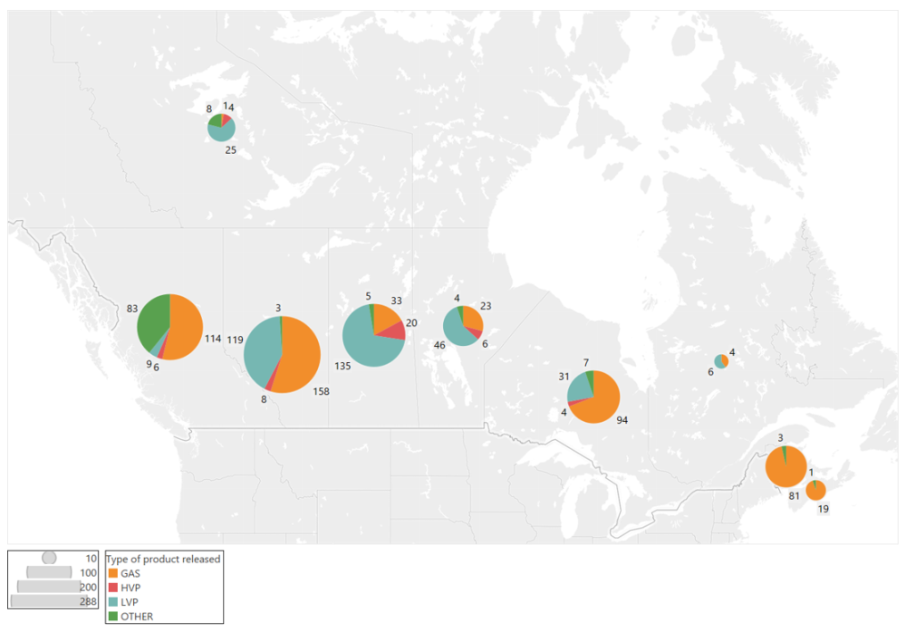 During the 11 years from 2008 to 2018, there have been 1060 occurrences across the country with releases of product. Half of those releases (527) were of hydrocarbon gas. Almost all product releases in New Brunswick (96%) and Nova Scotia (95%) involved hydrocarbon gases. Ontario (69%), Alberta (55%), and British Columbia (54%) had a broader mix of products released, but still a majority of releases were of gas. LVP hydrocarbons such as crude oil, condensate, or refined products were the next most commonly released substances, accounting for 35% of the 1060 total occurrences. LVP products accounted for 70% of occurrences with release in Saskatchewan, 66% in the Northwest Territories, 60% in Quebec, and 58% in Manitoba. HVP hydrocarbons accounted for less than 5% of all product releases over the 11-year period, and other (non-hydrocarbon) products such as sulphur or other products were involved in about 10% of all occurrences with releases during the period.