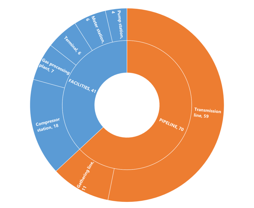 During the 10-year period from 2008 to 2017, there were 937 occurrences (71%) at facilities and 389 (29%) at locations along pipeline. However, in 2018 more than half (62%) of the occurrences (69 of 110) occurred at locations along pipeline. This is due in part to the high number of reports of geotechnical, hydrotechnical or other environmental activity that affected sections of pipeline during the year. Of the 41 incidents at facilities in 2018, 18 occurred at compressor stations, 7 were at gas processing plants, 6 at meter stations, 4 at pump stations, and 6 at terminals.