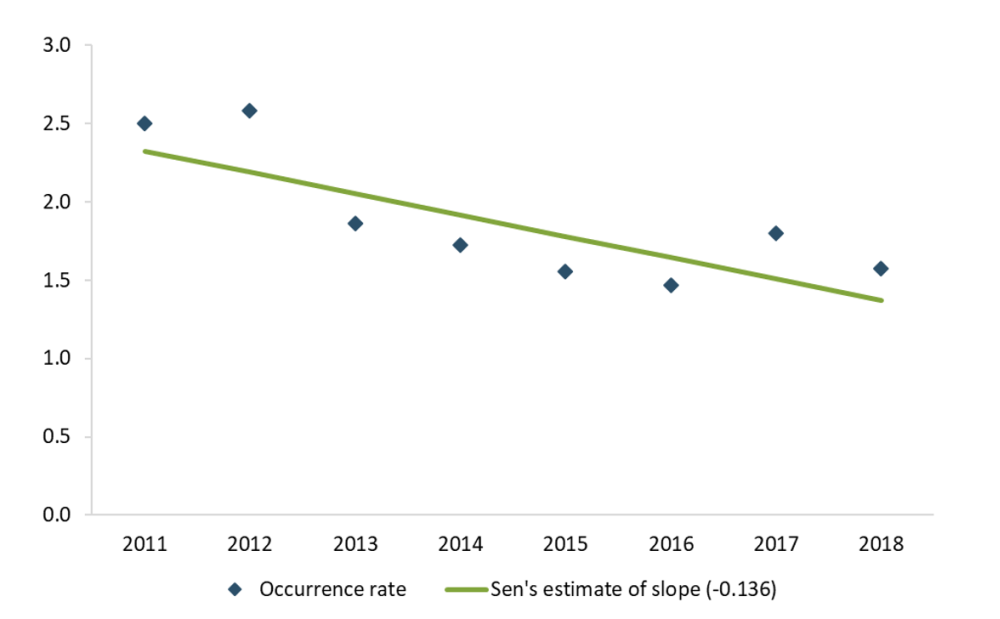 Kendall's tau-b (τb) correlation coefficient is a nonparametric measure of the strength and direction of association that exists between two variables. Kendall's τb was calculated on the 8-year series of occurrence rate values by year from 2011 to 2018.Footnote 4 There was a strong, negative correlation that indicates a downward trend in occurrence rate per 1000 km over the period (τb = −0.5714, p = 0.0478). Sen's estimate of slope, the amount of downward rate change per year, was −0.136 occurrences per 1000 km per year.