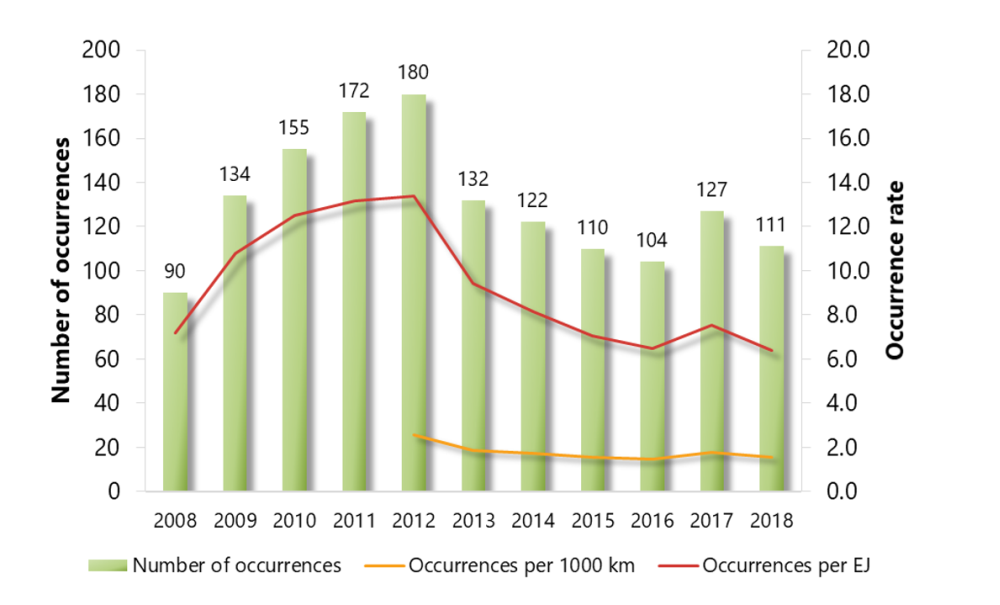 | Year | Number of occurrences | Occurrences per EJ | Occurrences per 1000 km |