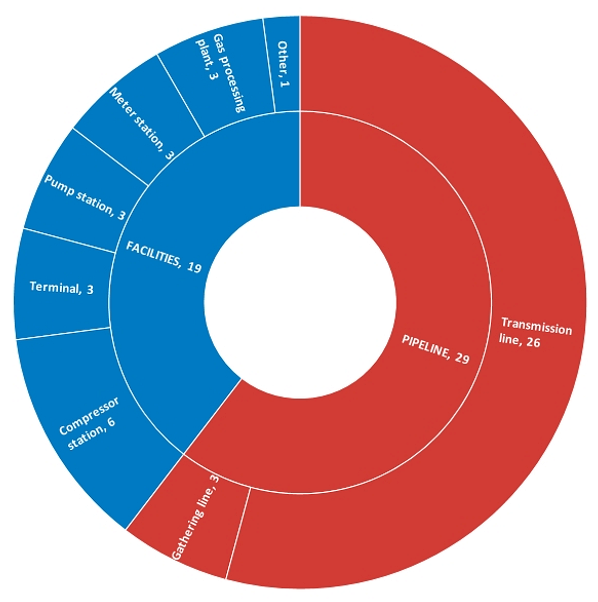 | Facility or pipeline | Facility type or pipeline type | Number of occurrences |