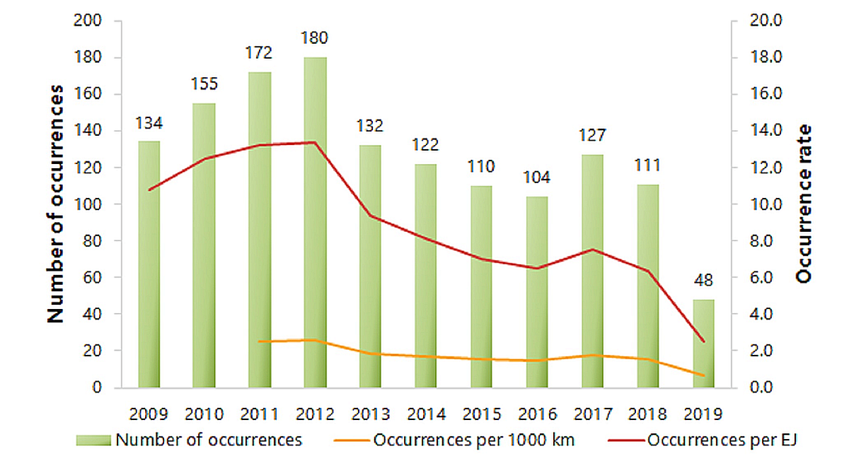 | Year | Number of occurrences | Occurrences per 1000 km | Occurrences per EJ |