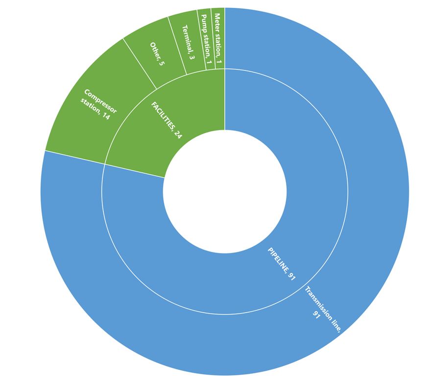 | Facility or pipeline | Facility type or pipeline type | Occurrences | Accidents | Incidents |