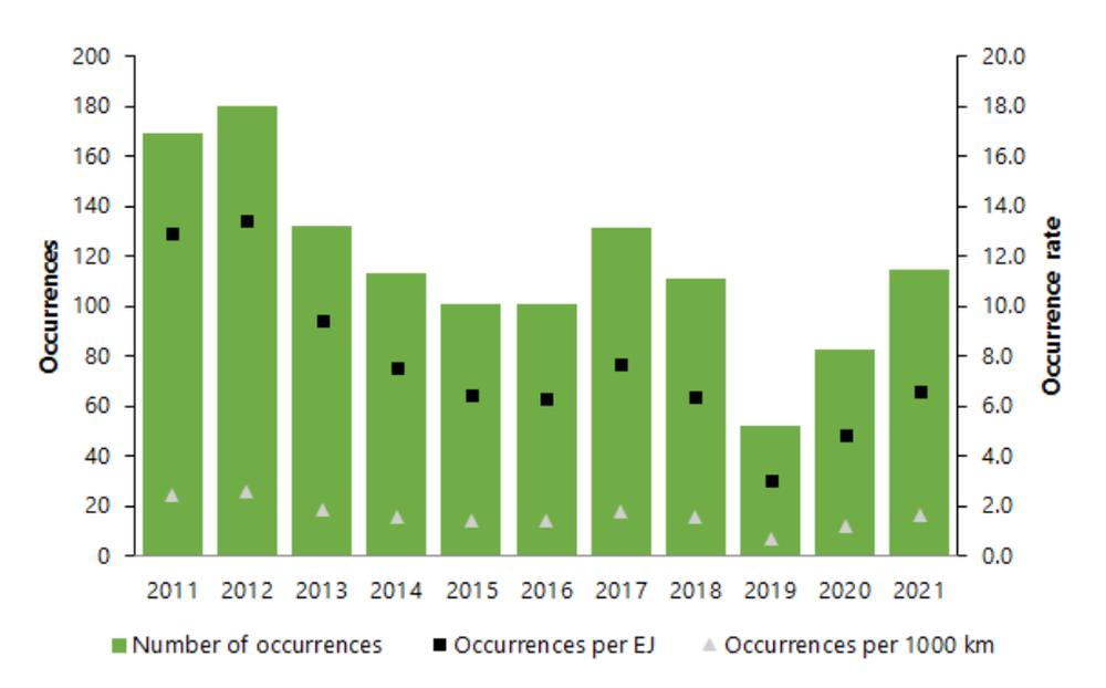 | Year | Number of occurrences | Occurrences per EJ | Occurrences per 1000 km |