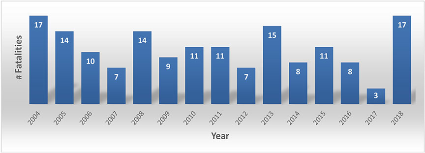 Figure 1 shows the number of fishing fatalities over the last 15 years against the wider backdrop of commercial fishing activity in Canada in the same period (figure 2 and figure 3). Despite various safety initiatives, the number of fatalities continues to fluctuate widely from year to year without showing any sign of a downward trend. From 3 fatalities in 2017, the number increased to 17 in the first 10 months of 2018.