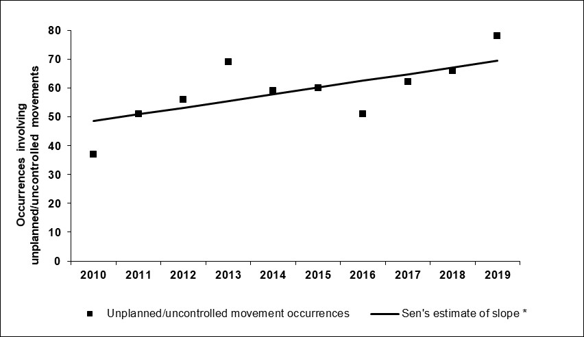 Between 2010 and 2019, the trend of unplanned/uncontrolled movements was on an upward trajectory, with a peak of 78 occurrences in 2019.