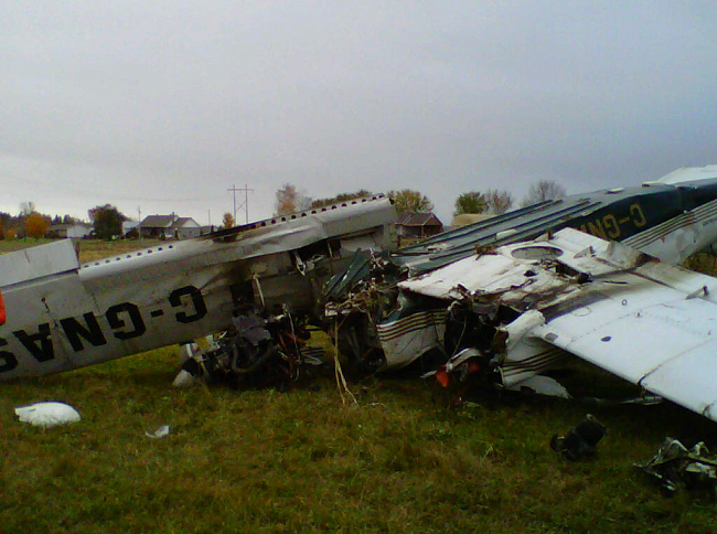 Le Piper PA-34-200 (immatriculation C-GNAS, numéro de série 34-7350133) décolle de l'aéroport de Trois-Rivières (Québec) avec 2 pilotes à son bord pour effectuer un vol d'entraînement aux instruments. À 2100 pieds d'altitude, lors du segment d'approche interrompue à l'aéroport de Victoriaville (Québec), le moteur droit subit un bris catastrophique et prend feu. À 14 h 2 min, heure avancée de l'Est, l'élève-pilote déclare une situation d'urgence liée à l'incendie moteur et signale son intention d'atterrir. Pendant ce temps, une fumée dense se propage dans le poste de pilotage. L'aéronef fait demi-tour et descend rapidement pour tenter d'atterrir dans un champ situé à 2 milles marins à l'est de l'aéroport de Victoriaville. L'appareil heurte le sol brutalement et s'immobilise sur le dos. Les 2 pilotes subissent de graves blessures. Un témoin prête secours aux occupants dans les minutes qui suivent l'accident. Le service d'incendie de Victoriaville arrive sur les lieux quelque 10 minutes plus tard. La radiobalise de repérage d'urgence de 406 MHz s'est activée au moment de l'impact.