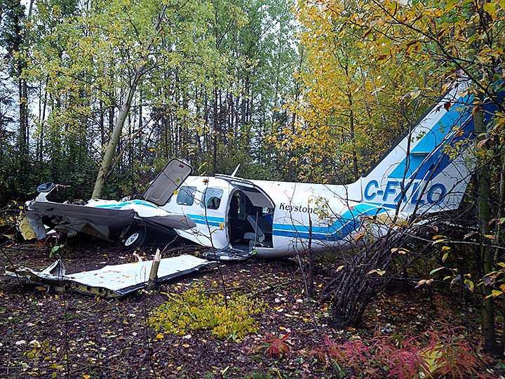 À 18 h 17, heure avancée du Centre, l’aéronef Piper PA-31-350 (immatriculé C-FXLO, numéro de série 31-8052022), exploité par Keystone Air Service Ltd., a décollé de la piste 06 de l’aéroport de Thompson (Manitoba) pour effectuer un vol selon les règles de vol aux instruments à destination de l’aéroport international James Armstrong Richardson de Winnipeg (Manitoba) avec 2 pilotes et 6 passagers à son bord. Peu de temps après la rotation, les 2 moteurs ont commencé à perdre leur puissance. L’équipage a tenté de retourner à l’aéroport, mais l’aéronef ne pouvait maintenir l’altitude. Le train d’atterrissage a été sorti en prévision d’un atterrissage forcé sur une autoroute située au sud-ouest de l’aéroport. En raison de véhicules qui approchaient sur l’autoroute, l’atterrissage forcé a été effectué dans une zone boisée adjacente à cette dernière, à environ 700 mètres au sud du seuil de la piste 06. Les occupants ont subi des blessures de gravité variable, mais ont été en mesure de se porter mutuellement assistance et de sortir de l’aéronef. La radiobalise de repérage d’urgence s’est déclenchée; il n’y a pas eu d’incendie. Les services d’urgence ont été contactés au moyen d’un appel au 911 et par la station d’information de vol de l’aéroport de Thompson. Des shérifs du ministère de la Justice du Manitoba qui roulaient sur l’autoroute ont été les premiers à prêter assistance après qu’un membre de l’équipage leur ait fait signe d’arrêter