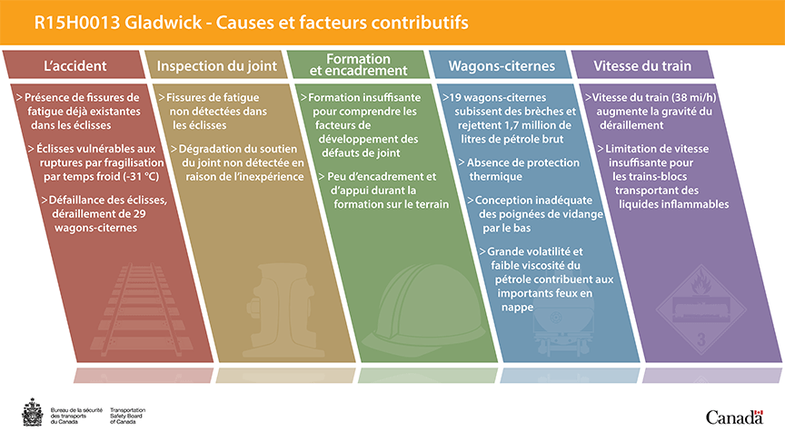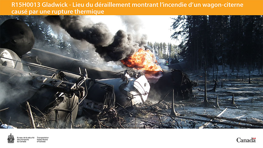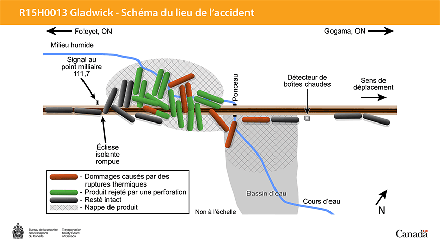 Le vers 23 h 35 (heure normale de l'Est), le train-bloc de pétrole brut U70451-10 de la Compagnie des chemins de fer nationaux du Canada (le CN) circulait vers l'est à environ 38 mi/h dans la subdivision de Ruel du CN lorsqu'un freinage d'urgence provenant de la conduite générale s'est produit au point milliaire 111,7, à Gladwick, près de Gogama (Ontario). Une inspection subséquente a permis de constater que les wagons 7 à 35 (29 wagons au total) avaient déraillé. Dix-neuf wagons-citernes ont subi des brèches, et environ 1,7 million de litres de pétrole brut ont été rejetés dans l'atmosphère ou dans le sol. Le produit rejeté s'est enflammé et a brûlé pendant 5 jours. Le déraillement a détruit quelque 900 pieds de voie principale. Il n'y a eu aucune évacuation ni aucun blessé.