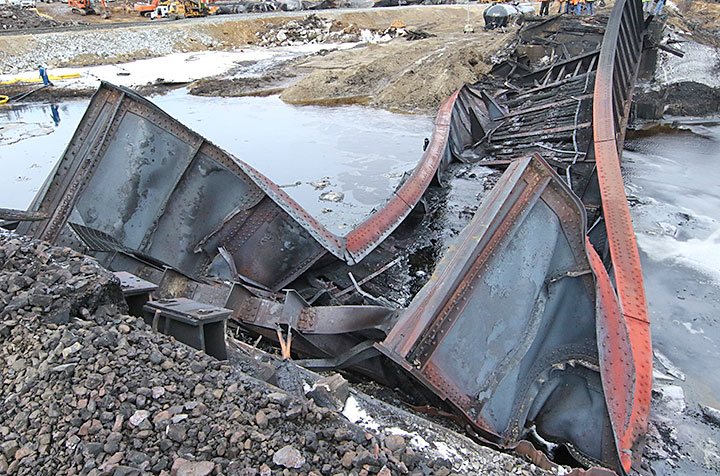Le , vers 2 h 42 (heure normale de l'Est), le train-bloc de pétrole brut U70451-02 de la Compagnie des chemins de fer nationaux du Canada (le CN) circulait vers l'est à environ 43 mi/h dans la subdivision de Ruel du CN lorsqu'un freinage d'urgence provenant de la conduite générale s'est produit au point milliaire 88,70, près de Gogama (Ontario). Une inspection subséquente a permis de constater que les wagons 6 à 44 (39 wagons au total) avaient déraillé. Par suite du déraillement, environ 2,6 millions de litres de pétrole brut (UN 1267) ont été rejetés dans l'atmosphère, dans l'eau ou dans le sol. Le produit rejeté s'est enflammé et a causé des explosions, et du produit s'est écoulé dans la rivière Makami située à proximité. Le déraillement a détruit le pont du CN enjambant cette rivière (au point milliaire 88,70) et quelque 1000 pieds de voie. Il n'y a eu aucune évacuation ni aucun blessé.