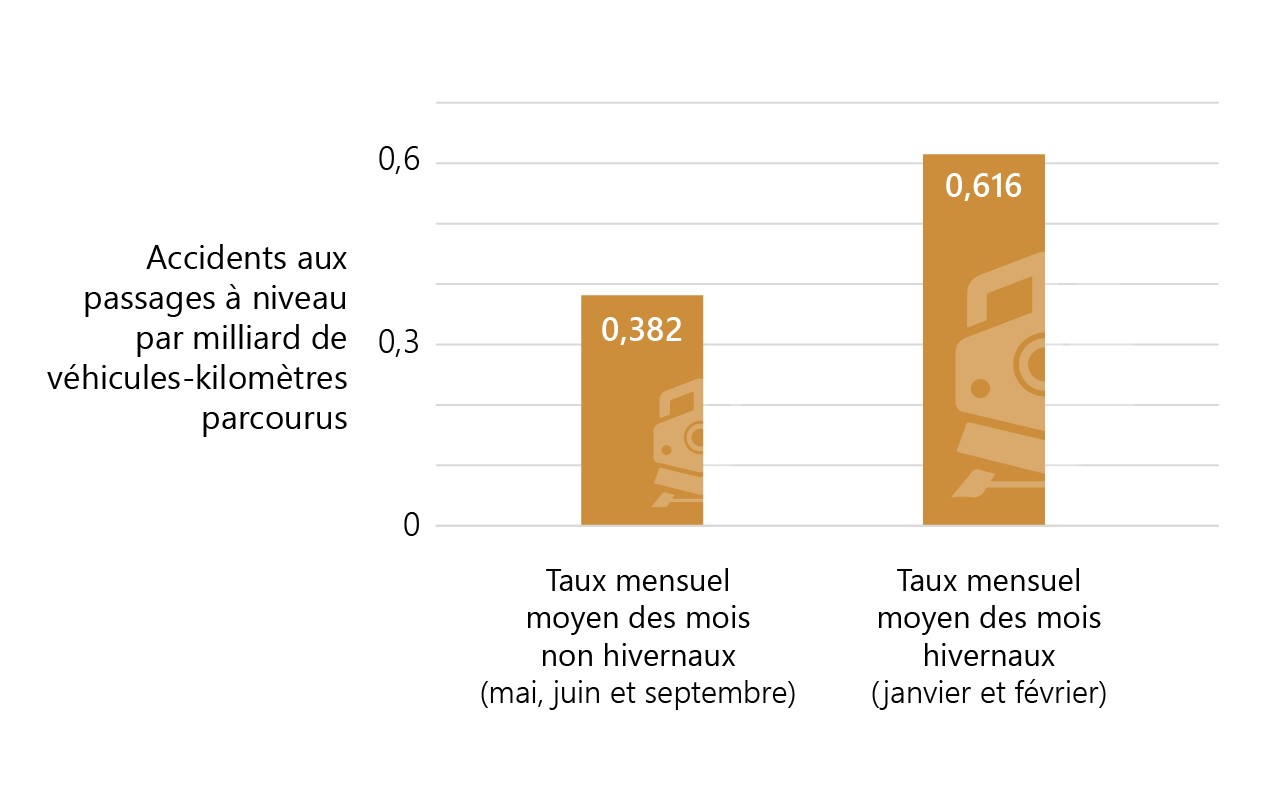 Chaque année, environ 23 personnes perdent la vie et 28 autres subissent des blessures graves à un passage à niveau au Canada. En 2019, 29 % des accidents survenus aux passages à niveau ont causé des blessures graves ou mortelles, ce qui les place parmi les types d’accidents ferroviaires les plus meurtriers. Pour améliorer la sécurité des transports au Canada et dans le monde, le BST doit cerner et communiquer les lacunes de sécurité qui contribuent à ce type d’accident afin d’élaborer des mesures de sécurité efficaces. La présente SII a pour but de bonifier les résultats issus d’analyses antérieures (voir la figure 1), qui démontrent une tendance saisonnière dans les accidents aux passages à niveau mettant en cause des véhicules motorisés, en effectuant une comparaison statistique entre les facteurs contributifs en hiver et ceux des autres mois de l’année, excluant les mois de vacances.