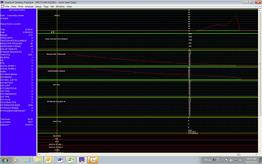 Les enregistrements représentant le plus grand intérêt portaient sur les paramètres suivants : la vitesse, le frein automatique, la pression dans la conduite générale, le frein direct, la pression dans les cylindres de frein et la position du levier du manipulateur, de la poignée du frein rhéostatique et du levier d’inversion du sens de marche (« inverseur » en abrégé). Les heures ont été enregistrées à un niveau de résolution de 1 seconde, et les distances et les points milliaires jusqu’à 0,01 mille, ou 53 pieds, ce qui signifie une valeur récapitulative maximale de 26,5 pieds.