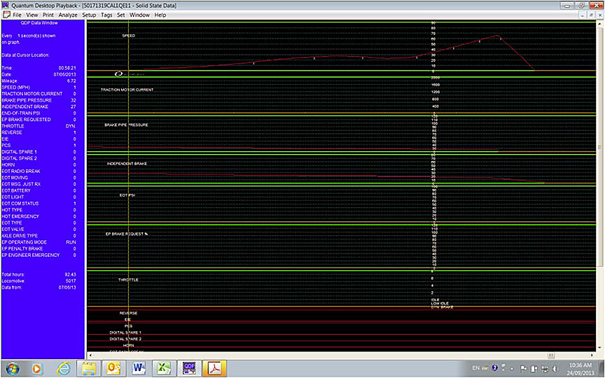 Le logiciel de lecture Quantum Desktop Playback de QEI a été installé, puis le fichier brut de téléchargement a été transféré avec succès. Lors de leur premier examen, on constata que les données n’étaient pas étalonnées. Pour les étalonner, on a mesuré un certain nombre d’emplacements, de dimensions de roue, de distances de déplacement et de temps de référence. On a examiné les enregistrements de l’UDF et du passage à niveau, puis on a tenté d’en synchroniser et d’en analyser les données avec celles du CEL. Ces données furent également mises en corrélation avec celles qui provenaient des examens sur le site et des constatations d’autres enquêtes. On a établi un certain nombre d’événements d’intérêt aux paramètres précis. L’établissement de la séquence d’événements ayant conduit au déraillement avait pour but d’aider à déterminer le scénario de déraillement le plus probable ainsi que les causes et les facteurs contributifs potentiels.