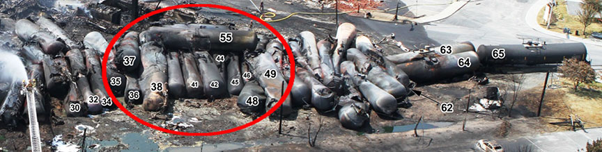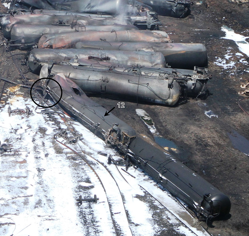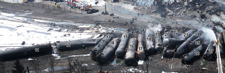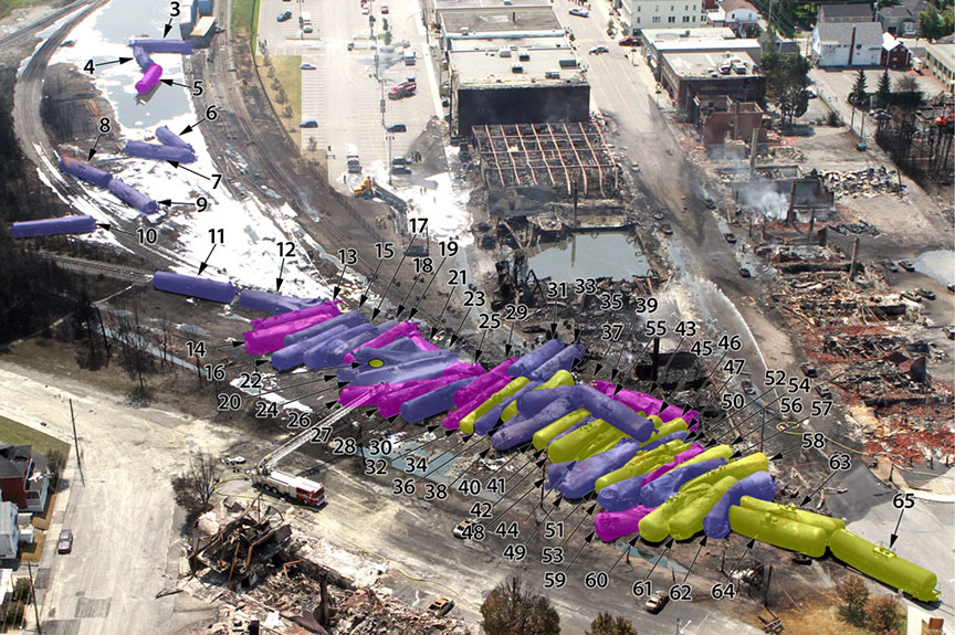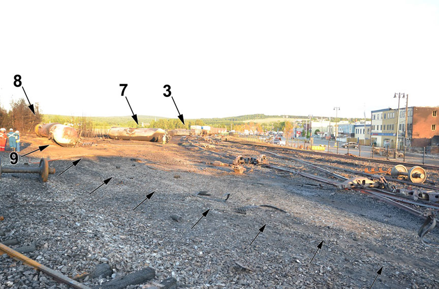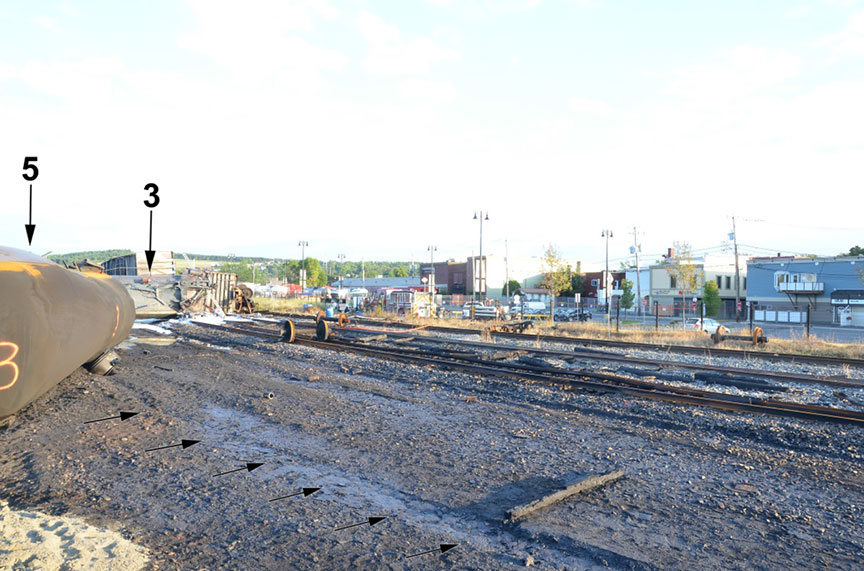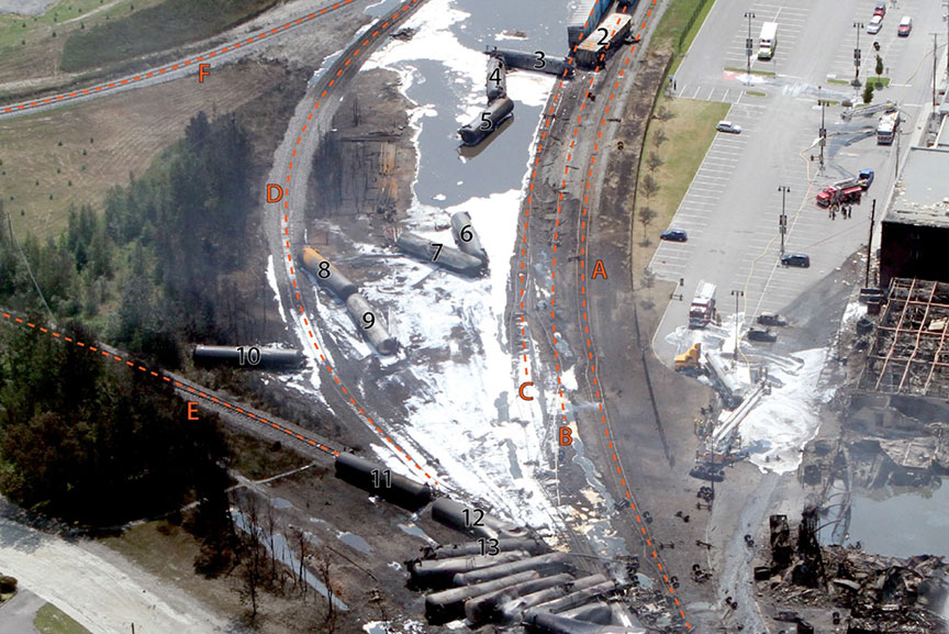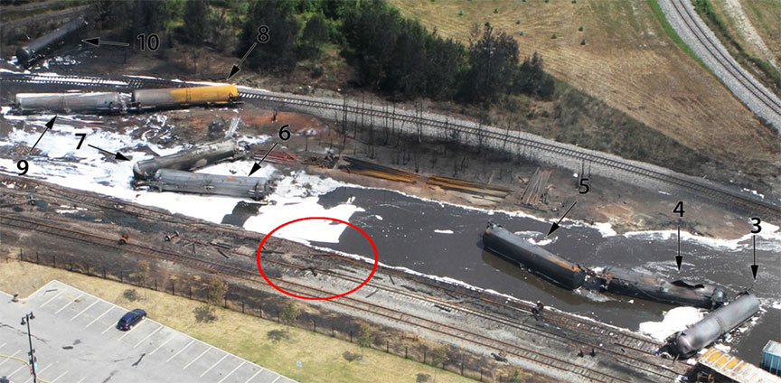 Vue aérienne de la zone du déraillement montrant la position des wagons-citernes déraillés à partir du wagon couvert (no 2 dans le convoi (dlc)) jusqu’au wagon-citerne NATX 310457 (no 13 dlc)