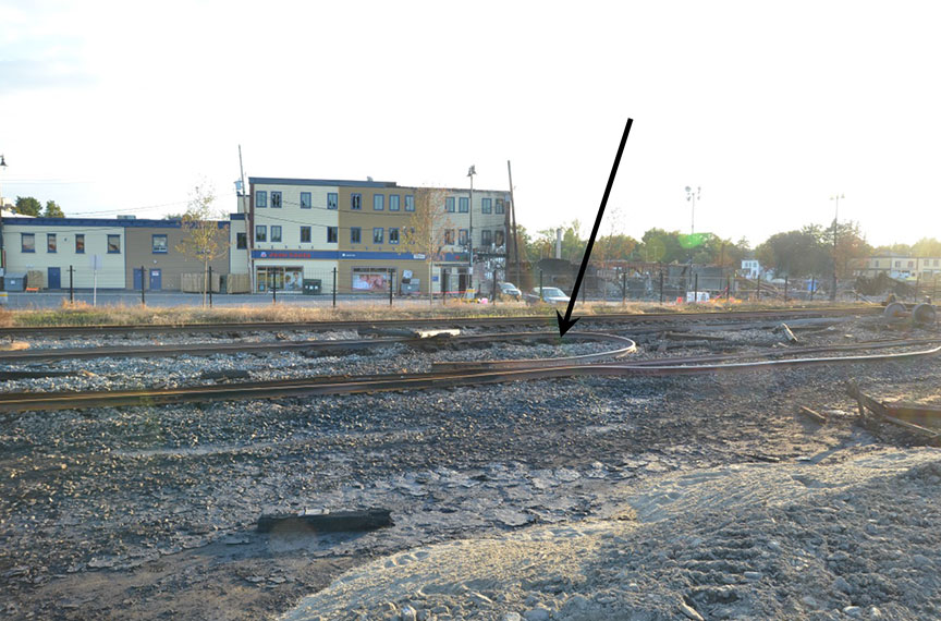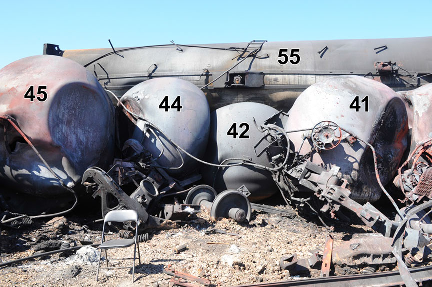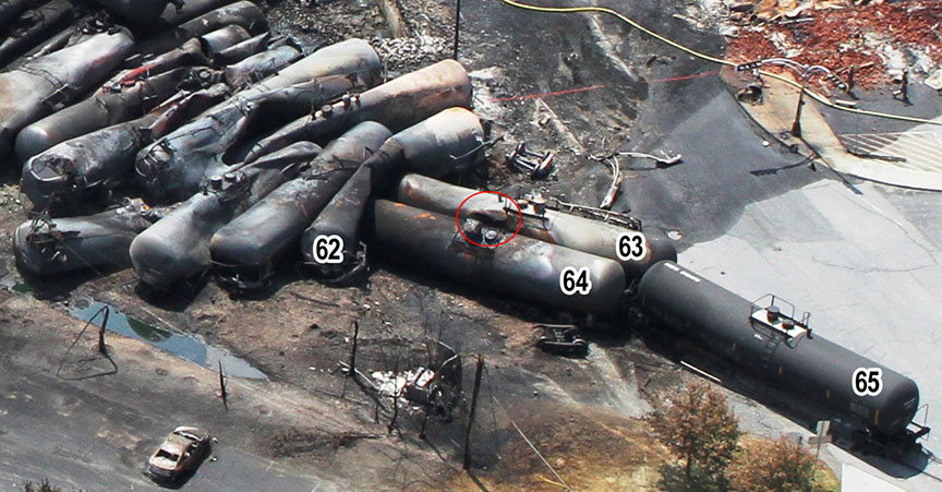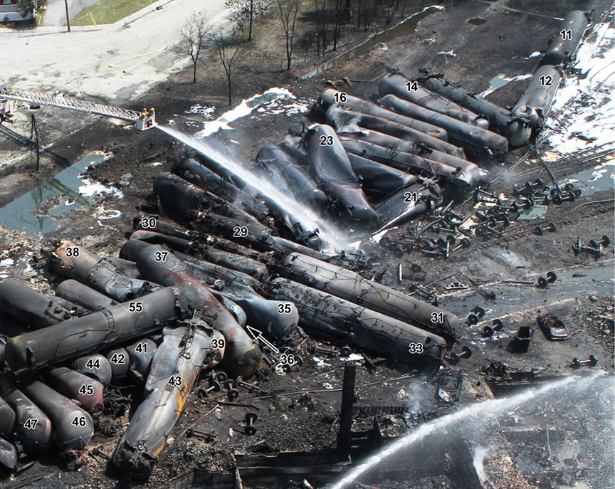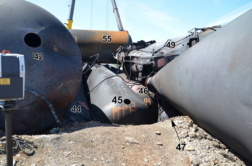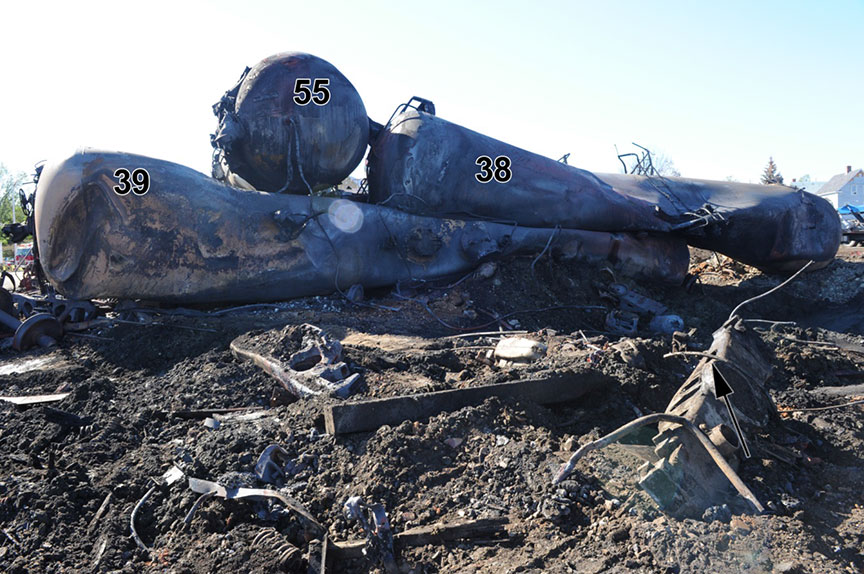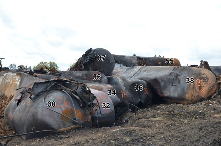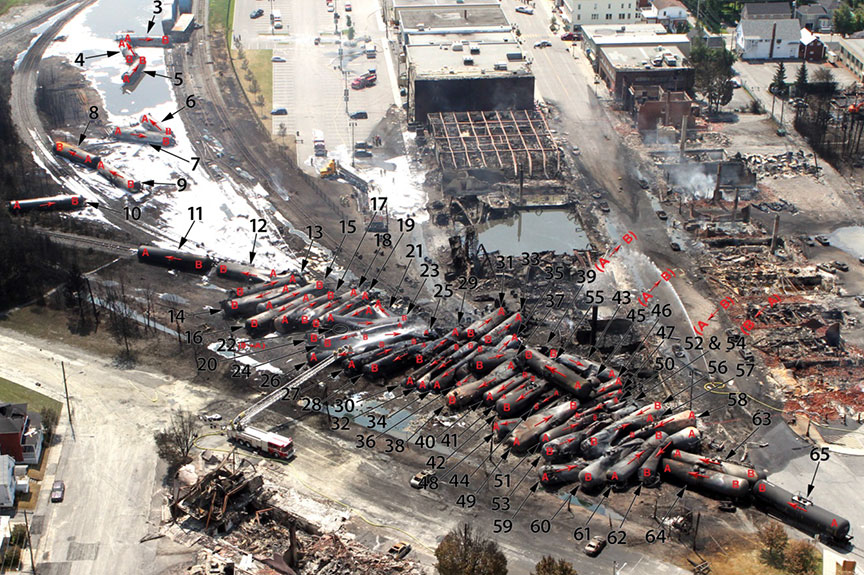 Vue aérienne de la zone du déraillement montrant la position des wagons-citernes déraillés à partir du wagon couvert (no 2 dans le convoi (dlc)) jusqu’au wagon-citerne NATX 310457 (no 13 dlc)