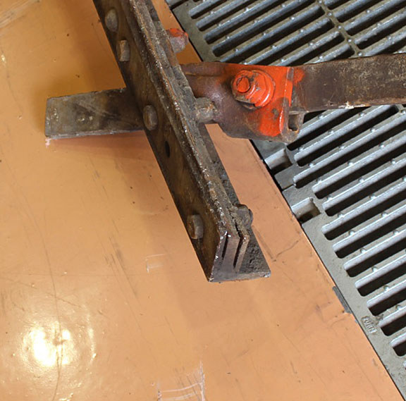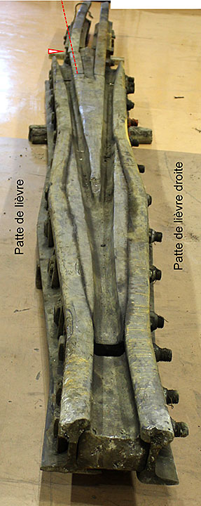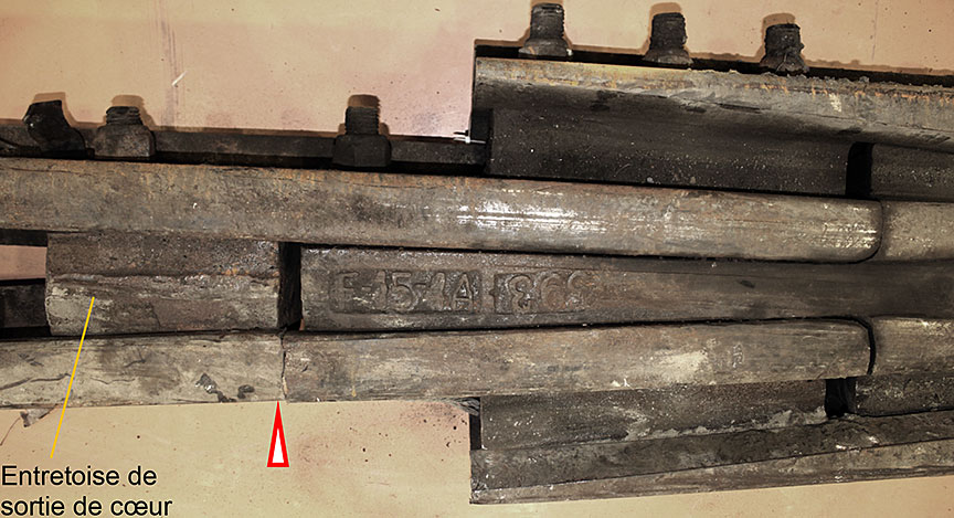 (c) Côté gauche de l'entretoise d'entrée de cœur. Photographie prise après le démontage partiel du cœur de croisement.