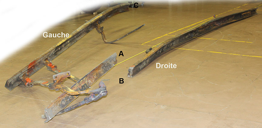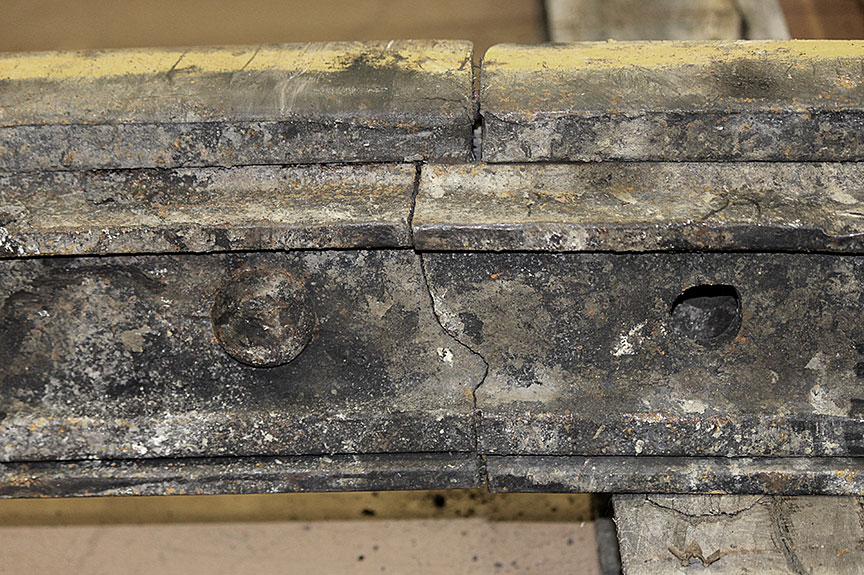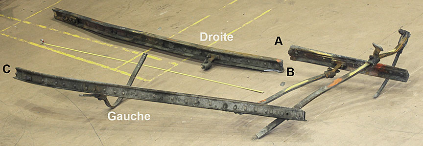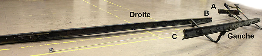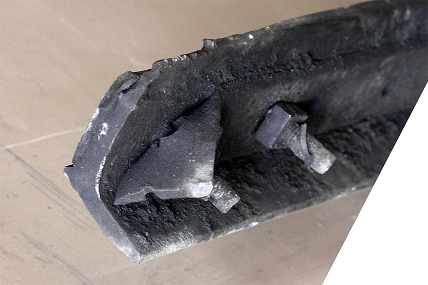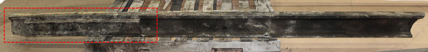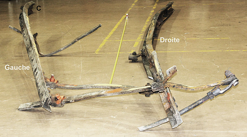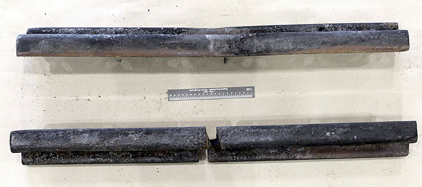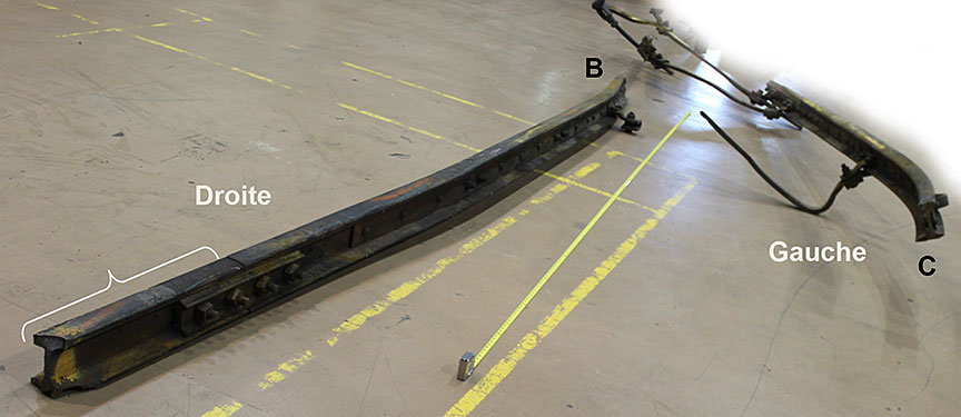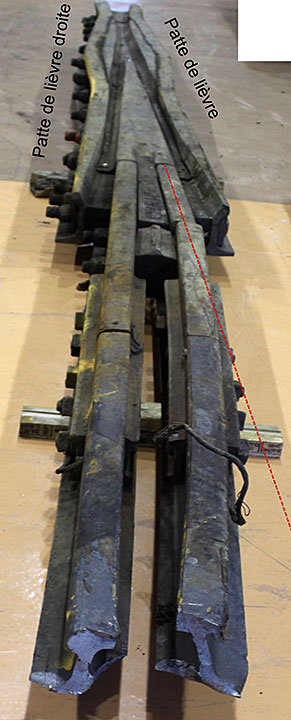 Sur le site de l’événement, on a découpé les rails du cœur de croisement raccordés aux rails de prolongement de pointe pour en faciliter le transport au Laboratoire d’ingénierie du BST (la partie inférieure de la figure 1d montre les extrémités coupées).