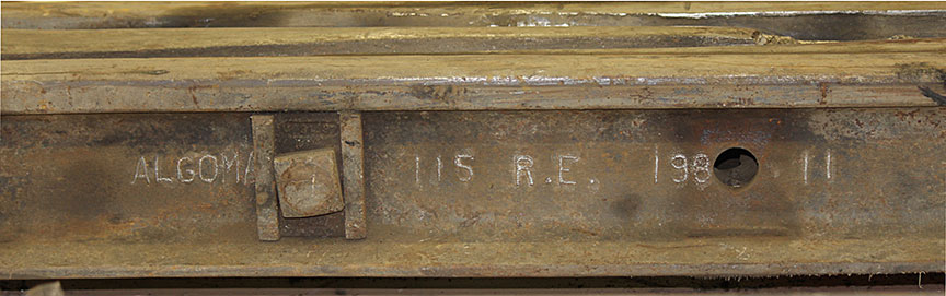 La figure 14 montre les deux morceaux de rail joints, comme ils se présentaient à la réception. Les deux morceaux mesuraient respectivement environ 8 pieds et 2 pieds de longueur. Le plus long portait les marques d’identification ALGOMA C.C. 115 LBS RE 1983; le plus court n’en portait aucune. L’éclisse du côté intérieur portait le marquage ALGOMA C.C. 115 LBS RE 1987. Le seul marquage discernable sur l’éclisse du côté extérieur se lisait ALGOMA … 1975 … PAT 1947.
