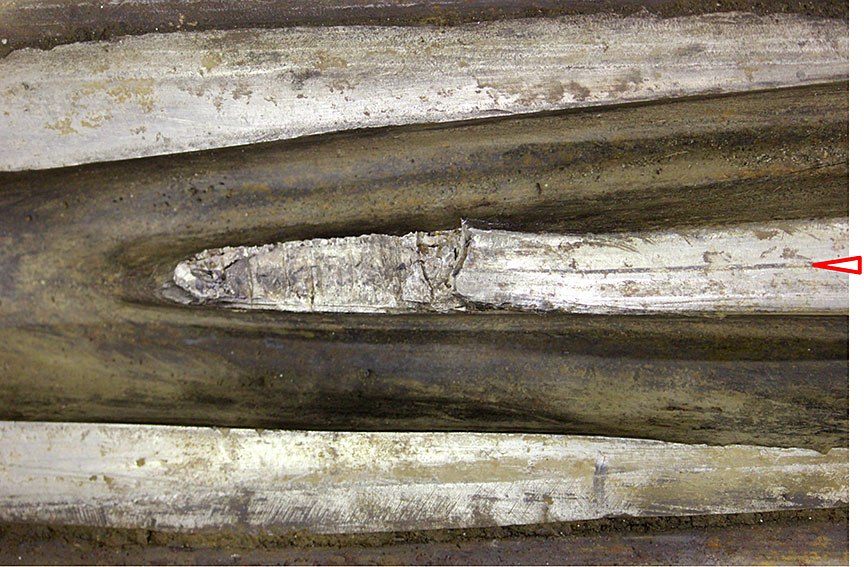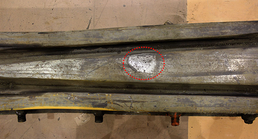 Comme on l’a mentionné dans le paragraphe précédent, la pointe du cœur avait probablement été réparée par soudage. De telles réparations sont permises et il faudrait retirer ou réparer tout cœur dont l’usure atteint 0,5 pouce à partir de son sommet Note de bas de page 3. La partie manquante de la pointe de cœur avait une épaisseur approximative de 0,5 pouce, ce qui indique que la pointe avait été réparée parce que son usure approchait de la limite. Il y avait aussi des signes de réparations en d’autres endroits du cœur; on en voit un exemple dans la figure 7.