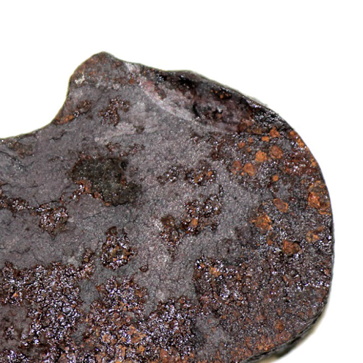 Le rail gauche de prolongement de pointe s’était rompu entre l’extrémité sortie de cœur de la partie centrale du cœur et l’entretoise de sortie de cœur (cet emplacement est indiqué par des flèches dans les figures 1b, figures 1c et figures 2a). La figure 4 montre un gros plan des surfaces de contact de rupture pour ce rail. Ces surfaces de rupture présentaient elles aussi une texture rugueuse caractéristique des ruptures dues à une contrainte excessive et avaient été endommagées par le feu. La fissure dans la partie amincie de l’entretoise de sortie de cœur (indiquée par une flèche dans la figure 2c) est survenue probablement en même temps que la rupture du rail de prolongement de pointe. Selon toute vraisemblance, c’est une force exercée sur le rail depuis le côté gauche qui a provoqué ces ruptures. Cette force a eu pour effet de pousser vers l’intérieur, en direction du rail de droite, le rail gauche de prolongement de pointe le long du rail de raccordement du cœur (voir les figures 1c et 1d, où l’orientation normale des rails de gauche est indiquée par des lignes pointillées rouges). La force en question a également déformé les éclisses reliant les rails de prolongement de pointe et ceux du cœur (figure 5). Remarquez l’absence d’un boulon, dont le trou correspondant est encerclé dans la figure 1a. Tous les trous des boulons d’éclisse et de rail présentaient un degré d’usure et de corrosion similaire, et il n’y avait aucun signe que certains avaient été exposés aux éléments plus longtemps que les autres. Il est donc probable que le boulon manquant s’est cassé et perdu au cours du présent événement.