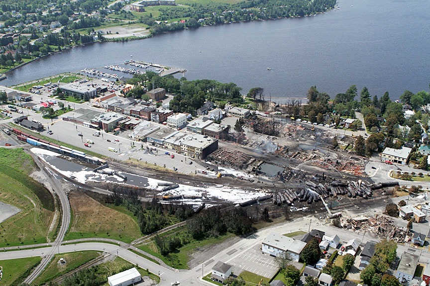 Le wagon couvert tampon déraillé a heurté une coupe de wagons stationnée sur la voie d’évitement. Les 8 wagons-citernes qui suivaient se sont dispersés dans des positions séparées de mise en portefeuille. Les 2 wagons-citernes suivants reposaient dans le sens de la voie d’évitement, sur le branchement, en avant de l’empilement principal en portefeuille constitué du reste des wagons-citernes déraillés, théâtre de l’incendie et des explosions. Les 9 derniers wagons du train restèrent sur les rails; le mécanicien de la locomotive et des intervenants d’urgence les ont dételés et éloignés du site du déraillement et de l’incendie. La figure 1 présente une vue aérienne du site de l’accident.