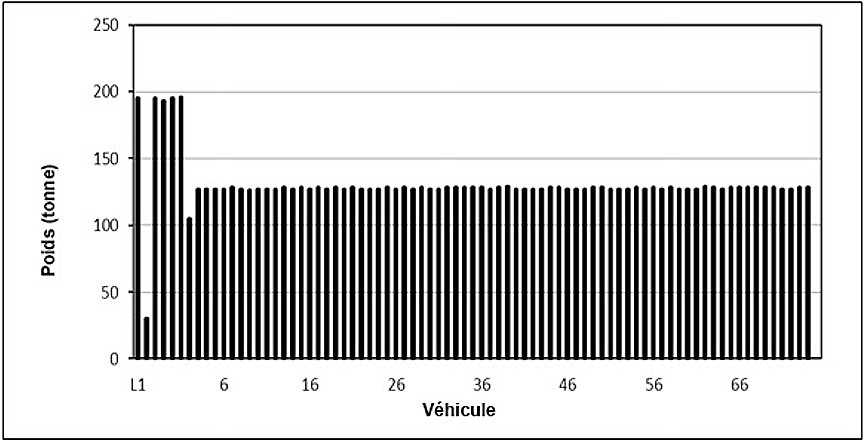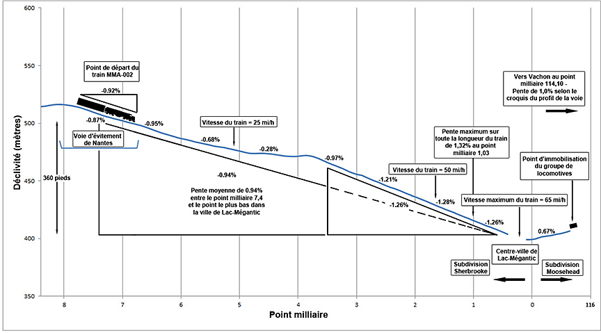 Le train MMA-02 se composait de 5 locomotives, de 1 fourgon VB-1 pour la commande à distance, de 1 wagon couvert chargé utilisé comme tampon et de 72 wagons-citernes de pétrole brut. Le train pesait 10 287 tonnes et mesurait 4 701 pieds de longueur. Le profil de tonnage du train est représenté à la figure 2.