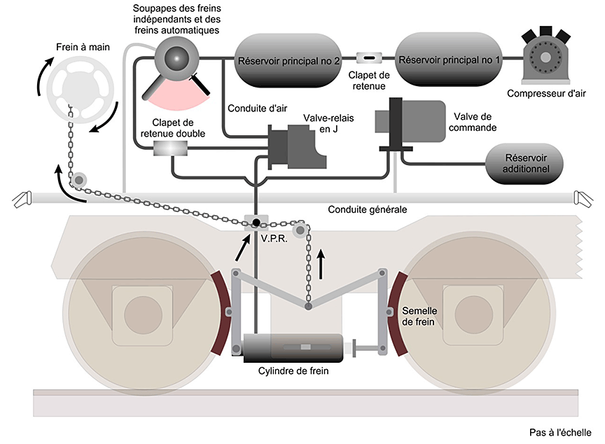 Un compresseur équipant chaque locomotive en activité alimente en air le système de freinage du train. L’air est emmagasiné dans chacun des réservoirs principaux de la locomotive à une pression d’environ 125 à 140 lb/po². Une soupape d’alimentation maintient la pression dans la conduite générale à une valeur approximative de 90 lb/po². La conduite générale s’étend sur toute la longueur du train et est raccordée par des boyaux aux deux extrémités de chaque locomotive et de chaque wagon. Chaque wagon est équipé de son propre système de freinage : cylindre de frein, semelles de frein, réservoir d’air auxiliaire, réservoir d’air d’urgence et autres composants connexes. Le réservoir auxiliaire fournit l’air nécessaire au serrage du frein automatique, tandis que le réservoir d’urgence fait de même en cas de freinage d’urgence. Les deux réservoirs sur le wagon sont reliés par un distributeur et réalimentés par la conduite générale.