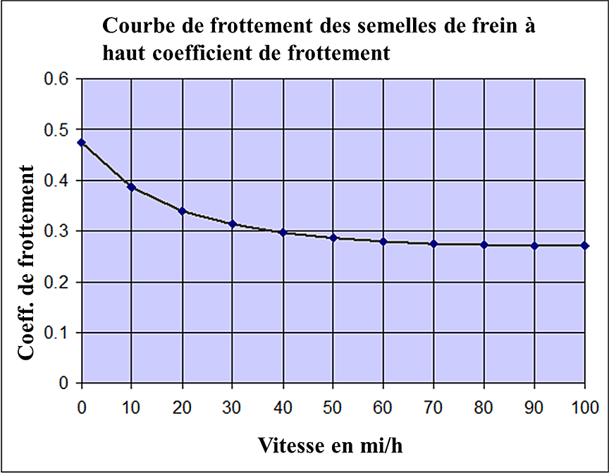 - Quand les surfaces en contact sont propres et sèches, le coefficient de frottement moyen entre la semelle de frein et la roue est de 0,315 dans la plage de vitesses 0-100 mi/h (selon le manuel).