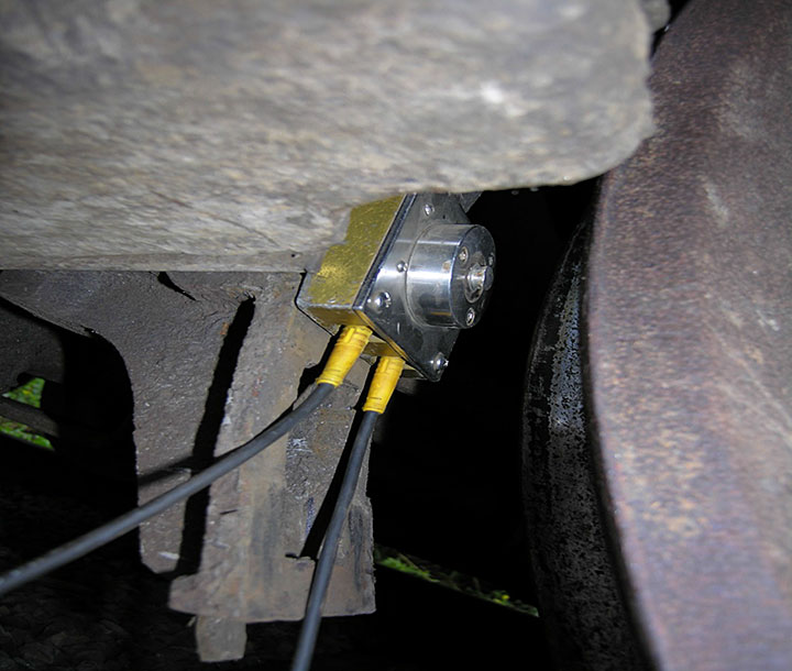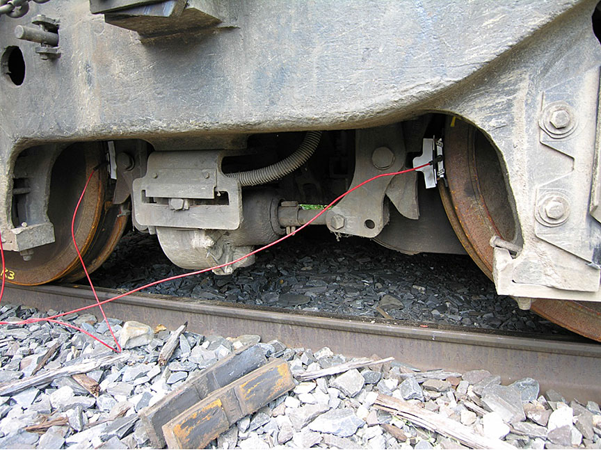 Les efforts aux semelles de frein sont mesurés à l’aide de trousses de mesure de conception et de fabrication spéciales. Les essais Golden Shoe, Jim Shoe et Smart Shoe sont les plus couramment utilisés sur le marché. Pour les essais effectués dans le cadre de la présente enquête, le BST a utilisé principalement le système d’essai Smart Shoe (figure 7). Sur le fourgon VB-1, on a utilisé une trousse d’essai Jim Shoe, dont la plage de mesures cependant s’est révélée insuffisante pour les essais sur les locomotives et les wagons-citernes. Les systèmes Golden Shoe et Jim Shoe font appel à des capteurs à compression (figure 8), tandis que le système d’essai Smart Shoe utilise des capteurs à jauge réglable mesurant la contrainte de flexion pour améliorer la précision. Le système Smart Shoe peut enregistrer les relevés dans des fichiers textes électroniques.