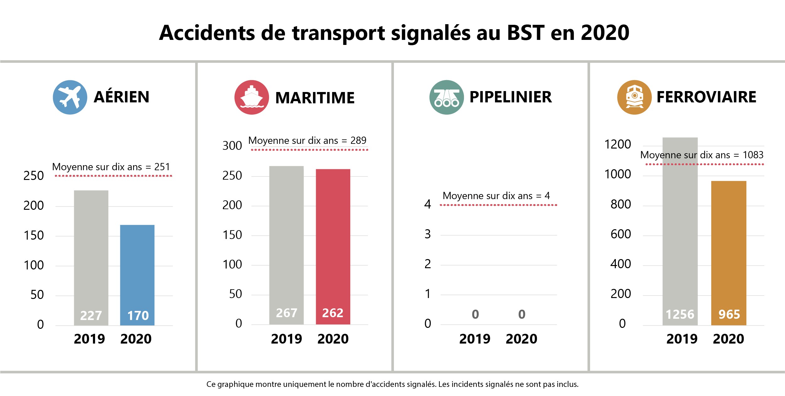 En 2020, 965 accidents ferroviaires ont été signalés au BST, soit une baisse par rapport aux 1256 accidents enregistrés en 2019, et une baisse de 11 % par rapport à la moyenne décennale (de 2010 à 2019) de 1083 accidents. Les trains de marchandises représentent 34 % de tous les trains en cause dans des accidents ferroviaires en 2020. Quatre pour cent (42 au total) étaient des trains de voyageurs; les 62 % qui restent étaient principalement constitués de wagons isolés ou de coupes de wagons, de locomotives et de véhicules d’entretien.