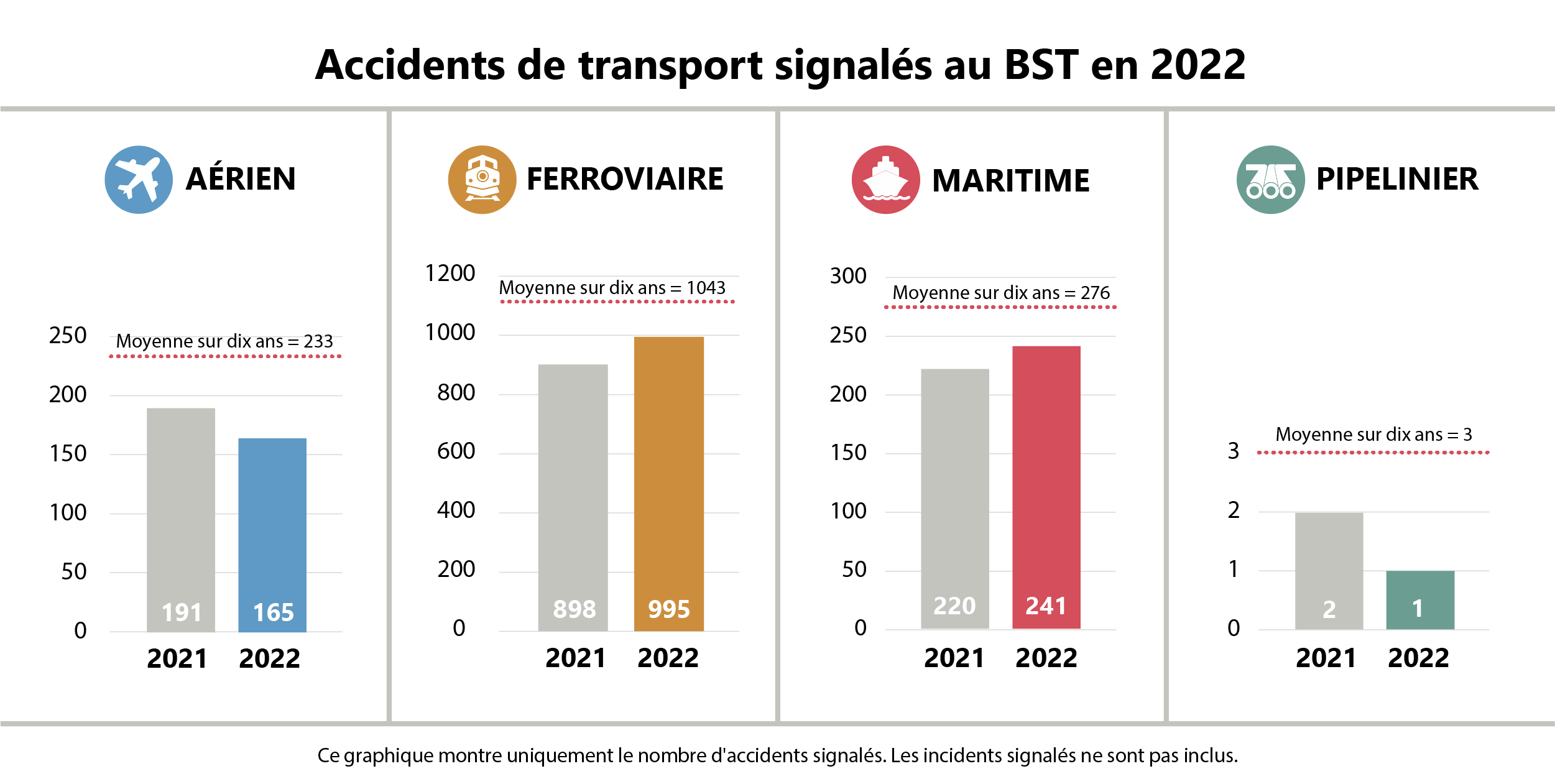 En 2022, on a signalé 995 accidents ferroviaires au BST, soit une légère augmentation par rapport à 2021 (898), mais une baisse de 5 % par rapport à la moyenne décennale précédente (1043).